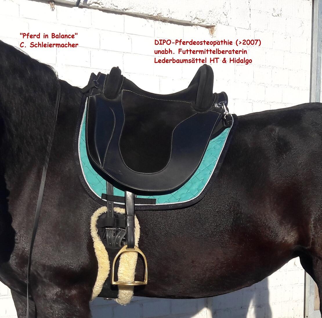 Meine Name ist Claudia Schleiermacher, ich bin seit 2007 Pferdeosteopathin nach DIPO. Zusätzlich biete ich Ihnen eine unabhängige Futterberatung für Ihr Pferd an. Berechnung des Ist-Futterzustandes, Änderungen in der Fütterung, auch für Pferde mit Vorerkrankungen. Als ehemalige Hidalgo Händlerin biete ich noch immer den Service von Sattelkontrollen, Vermittlung und Beratung an. Verkauf von Sätteln und Zubehör leider nicht mehr.