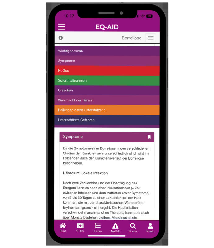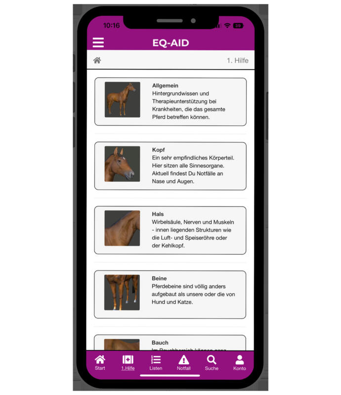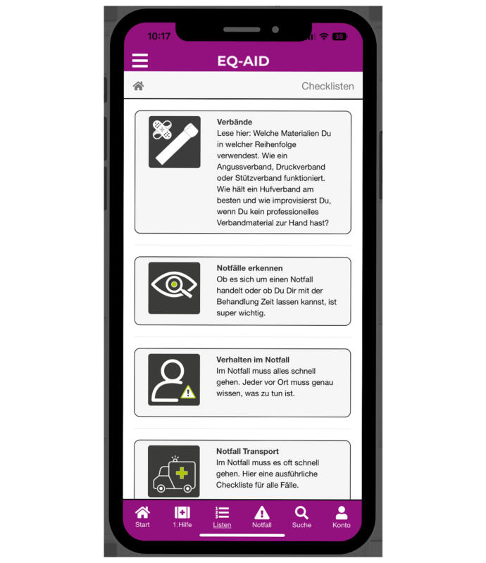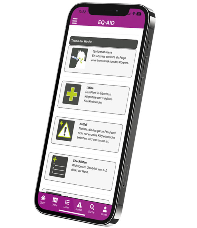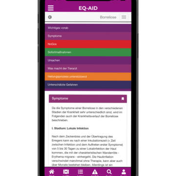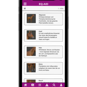 EQ-AID unterstützt Sie beim richtigen Umgang mit Ihrem Pferd in Notfällen und bei Krankheiten. Mit EQ-AID haben Sie die wichtigsten Informationen zu Krankheiten und Notfällen sowie wichtige Listen rund um die Pferdegesundheit immer dabei und zur Hand.