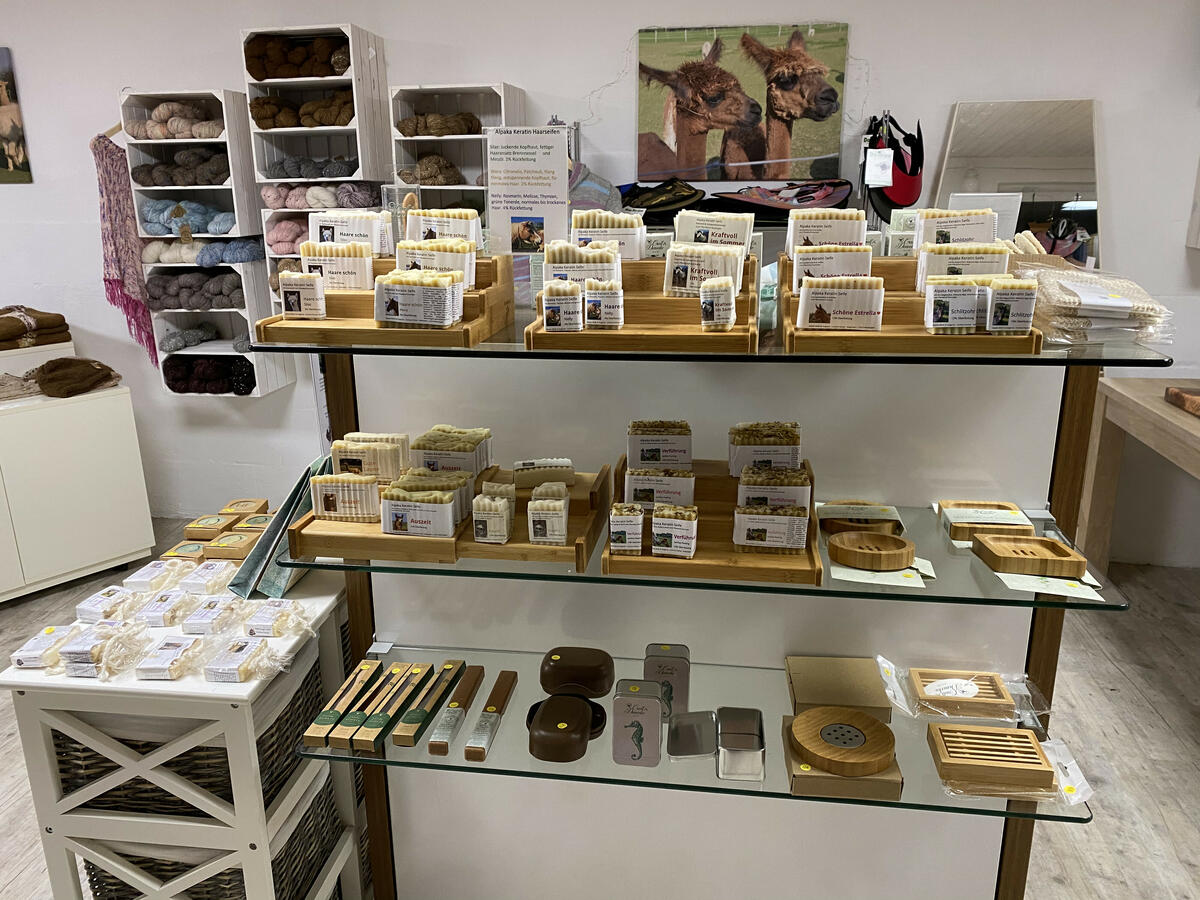 Wir bieten folgende Produkte an: Alpaka Wolle , fertige Gestricke, Naturseifen, Haarseifen, Naturkosmetik Produkte , Fan Artikel mit Bildern von unseren Alpakas, Deko Kissen, Geschenkpapier, Postkarten, Leinwandbilder, Emaille Becher, handgefertigte Bonbons, Kalender. Gutscheine zur Wanderung stellen wir auch aus.