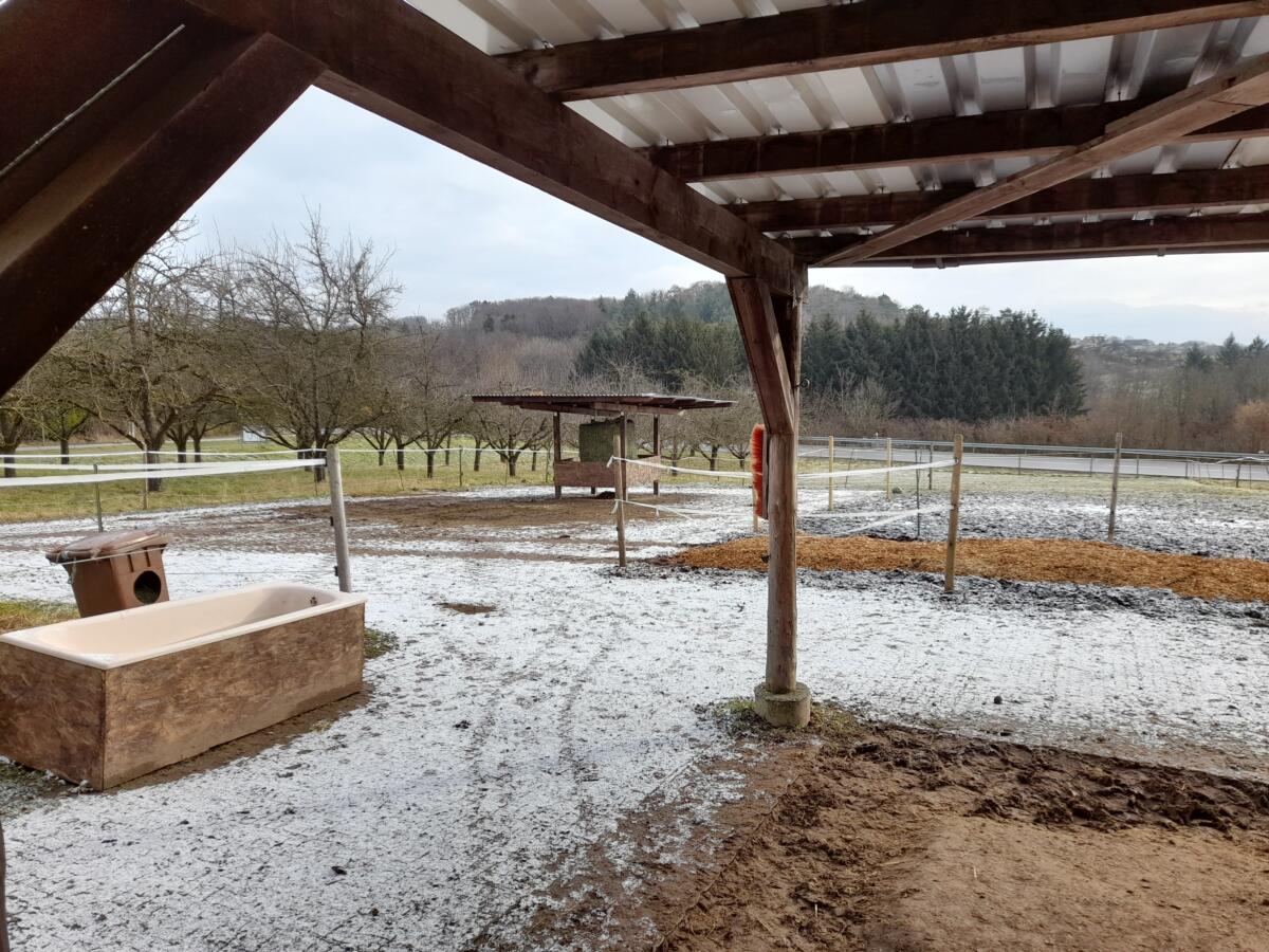 Wir haben einen großen befestigten Allwetterauslauf mit Weidehütte. Derzeit haben wir ca. 4 Hektar Koppeln und einen schönen 31mX18m Sandreitplatz.