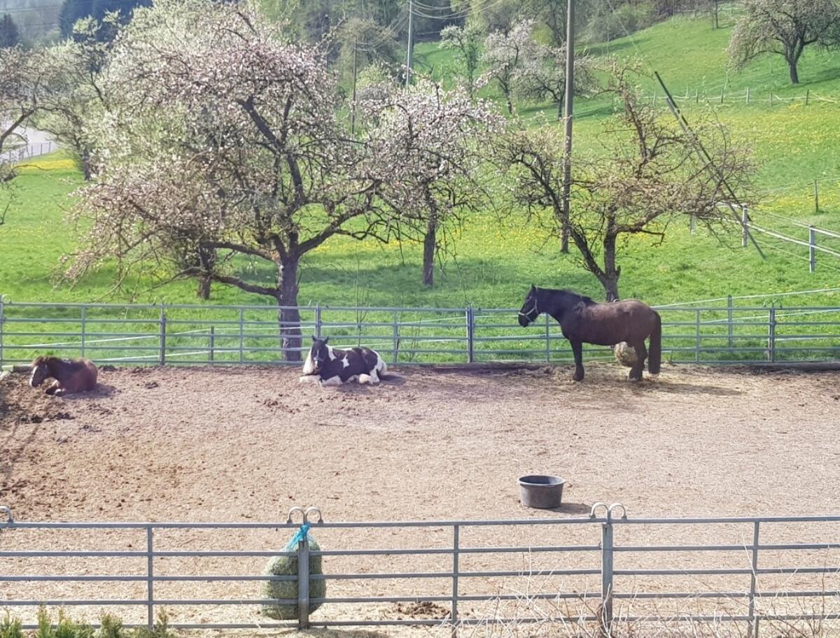 Viel Bewegung und Sozialkontakt ist Priorität bei uns im Stall. Im Sommer stehen die Pferde nach Möglichkeit Tag und Nacht auf der Weide und gehen nur stundenweise zum fressen und schlafen wärend der Hitzeperioden in die kühle Box (2-3 Stunden)