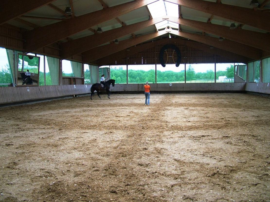 Die Reitanlage umfasst eine Licht und Luftdurchflutete Reithalle ( 20 m x 40 m) welche auf drei Seiten mit Windschutznetzen versehen ist. Ein besonders schöner Außenplatz ( 32 m x 74 m ) welcher eingebettet zwichen den sehr großzügigen gemeinschaftskoppeln liegt und eingefasst von einer wunderschönen Heinbuchenhecke ist. Auf diesem Reitplatz kann ein 20 m x 60 m Dressurviereck gestellt, als auch mit modernsten Hindernissen für den Parcours trainiert werden. Um das Bewegungsangebot abzurunden gibt es auch noch einen großen Longierzirkel und eine Führmaschine.