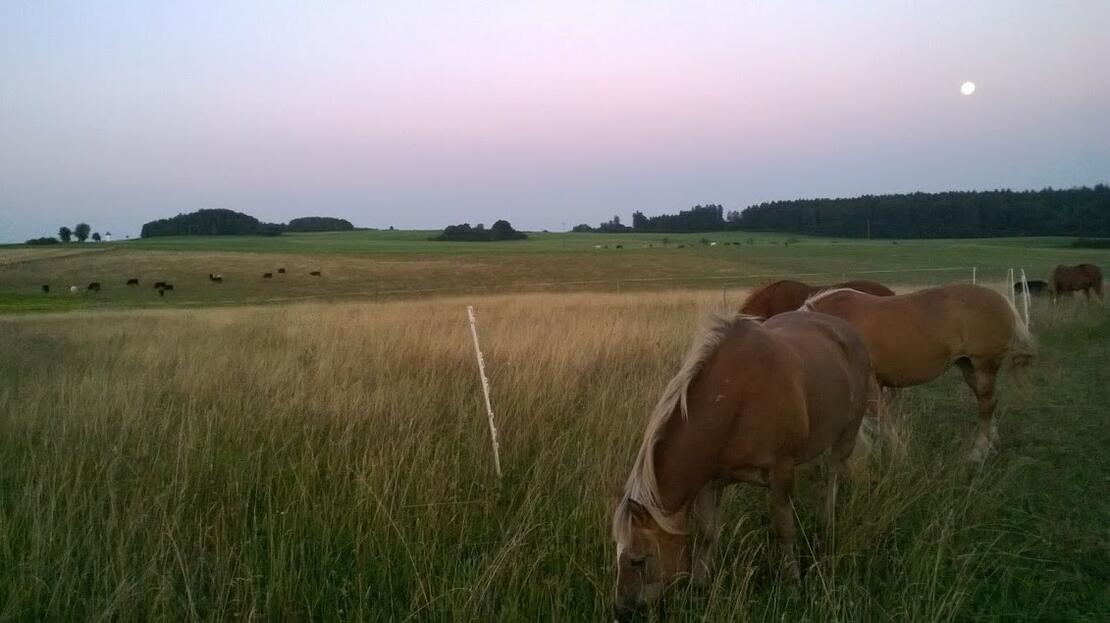 Rudis Ranch ist unser Biohof in Alleinlage. Hier haben wir unser Hobby zum Beruf gemacht und halten seit über 25 Jahren Pferde. Wir wollen unseren Tieren ein naturnahes Leben ermöglichen. Unseren Pferden stehen große Offenställe mit mehren Liegeflächen und großen befestigten Paddocks zur Verfügung. 40 Hektar Kräuterweiden liegen direkt am Hof und schließen am Stall an. So können wir unseren Pferden ganzjährigen Koppelgang bieten. Wie in freier Wildbahn können die Pferde selbst entscheiden, wann sie trinken, Heu fressen, weiden oder einfach unter Bäumen oder im Stall auf Stroh dösen wollen. Um allen Bedürfnissen unserer Pferde gerecht werden zu können, bieten wir zusätzlich einen Stall für Diätpferde, eine Wallachgruppe und auch zwei Esel leben mit uns auf Rudis Ranch. Neben einer artgerechten Haltung garantieren wir auch eine hochwertige Fütterung. Deshalb haben wir uns einer staatlichen Kontrollstelle angeschlossen, die uns unsere ökologische Vorgehensweise jährlich zertifiziert. Unsere Tiere weiden ausschließlich auf Kräuterweiden. Dies ist viel gesünder als die Haltung auf herkömmlichen eiweißreichem Grünland. Unser Heu erzeugen wir selbst auf eigenen Flächen. So haben wir Kontrolle über die Qualität unsers Futters. Zur Pflege unserer Weiden halten wir zusätzlich Galloway-Rinder. Die Wechselbeweidung und eine regelmäßige Entwurmung halten Tiere und Weiden gesund. Im Stall bieten wir den Pferden ständig neben Salz und Mineral- oder Himalayasalz einen Leckeimer mit Bio-Mineralfutter zur freien Verfügung an. Hühner runden das Bild unserer Ranch ab. Freilandhaltung ist für alle Tiere auf Rudis Ranch eine Selbstverständlichkeit. Neben dem direkt am Stall liegenden 30x40 Meter großen Reitplatz stellen wir Ihnen auch einen Roundpen zur Verfügung. Rudis Ranch liegt direkt am Rande des Donautals auf 800 Meter Höhe. Das bietet zahlreiche Möglichkeiten für herrliche Ausritte und Wanderungen. In unserer Reiterstube, mit Küchenecke und WC, können Sie sich nach einem schönen Ritt noch einen Kaffee oder Tee gönnen. Haben wir Ihr Intresse geweckt und sie wollen uns besuchen und näher kennenlernen? Sehr gerne! Wir freuen uns auf ihren Anruf oder eine Mail!