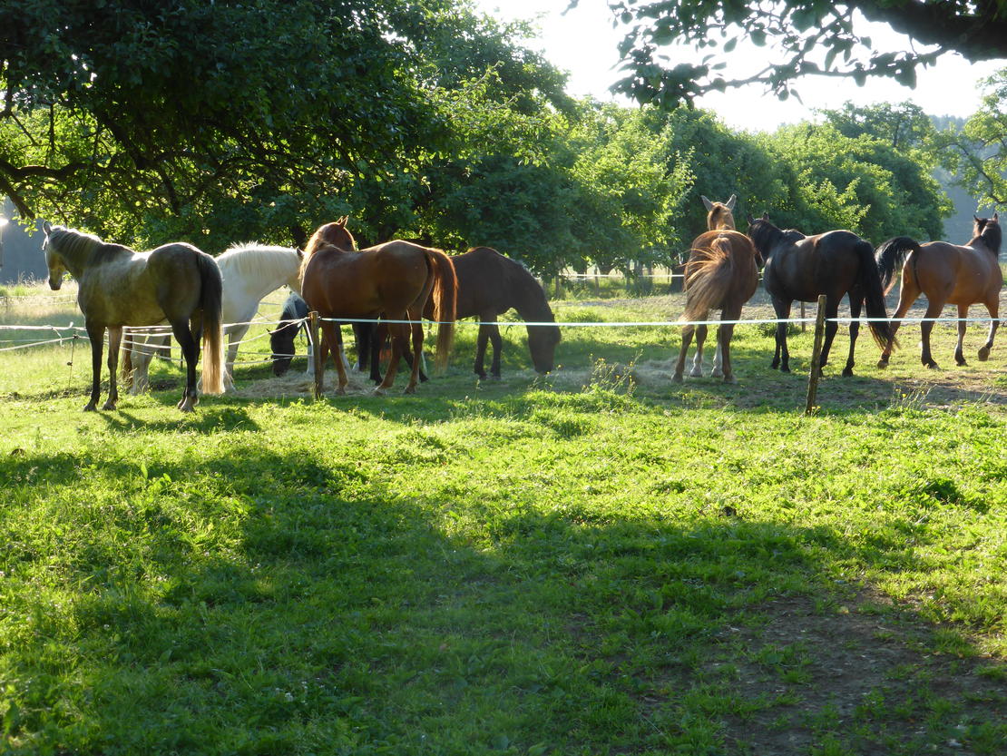 Die riesigen Weiden sind mit einem Laufgang bequem zu erreichen, auch für ein Paddock-Trail wäre genug Platz vorhanden. Die kleine Bewegungshalle und das Roundpen darf mitbenutzt werden, wir haben eine sehr kleine, familiäre Einstellergemeinschaft mit Freizeitpferden. Hengsthaltung ist möglich, wir haben bereits Hengste auf dem Hof - nicht weit getrennt von den Stuten. Für Züchter oder weiter entfernt wohnende Pferdehalter steht eine einfache Ferienwohnung zur Verfügung.