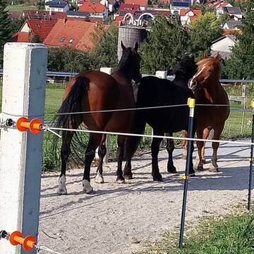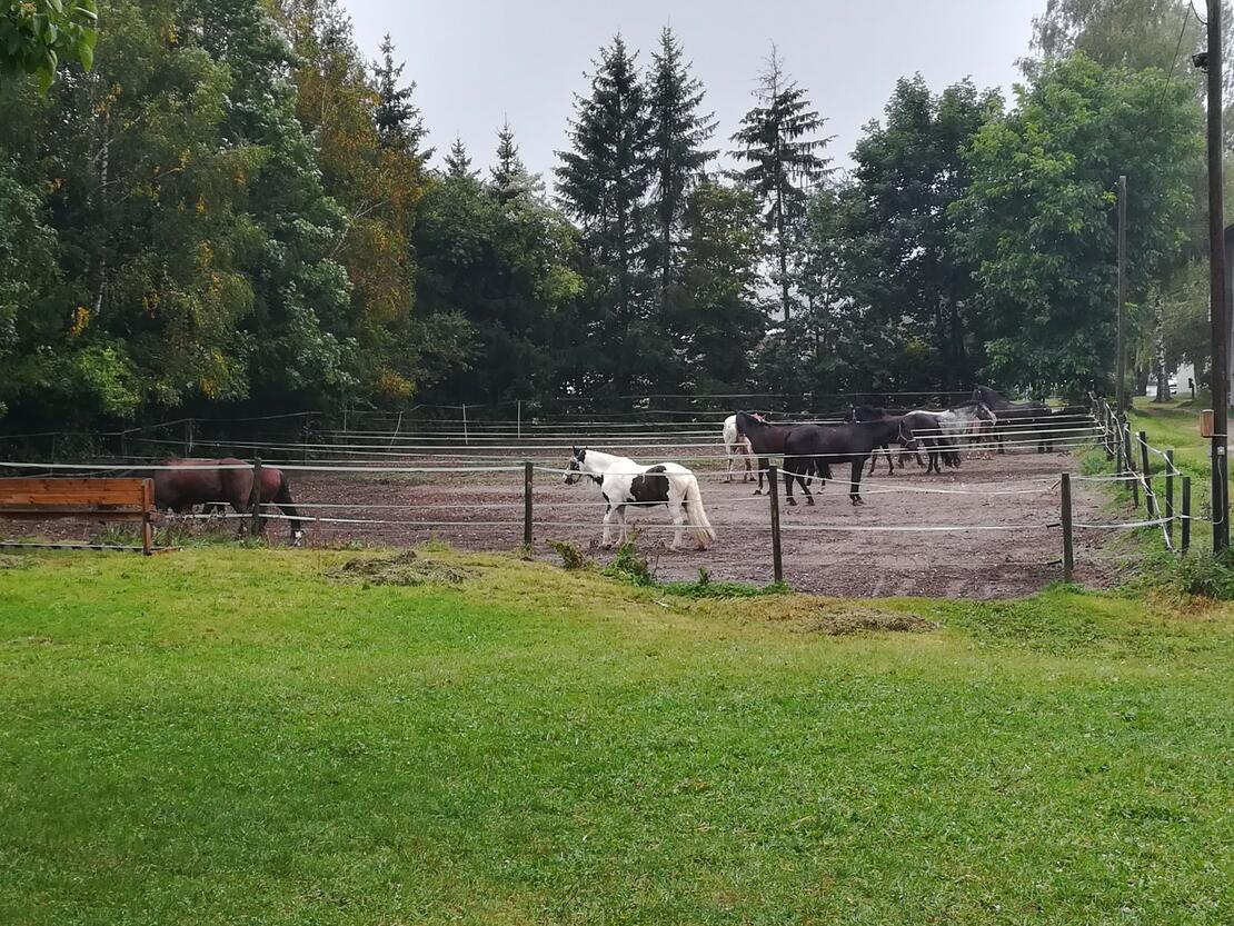 Bei durchnässtem Koppelboden steht ein Sandplatz mit 800 m² als Koppelersatz zur Verfügung , dieser ist in Paddockfeldern für 1 oder 2 Pferde eingeteilt.