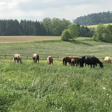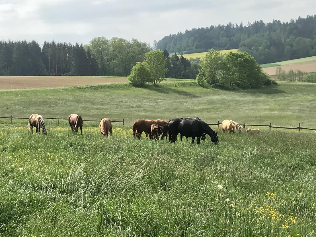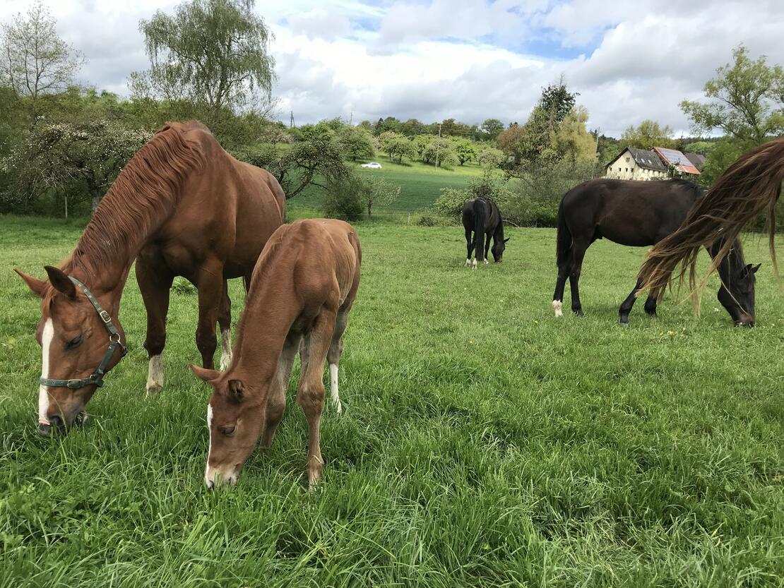 Der Hof ist über Generationen hinweg fest mit der Pferdezucht verwurzelt. Der aktuelle Pferdebestand besteht aus 3 Zuchtstuten und deren Aufzucht, welche sich über neue Herdenmitglieder sehr freuen würden.