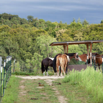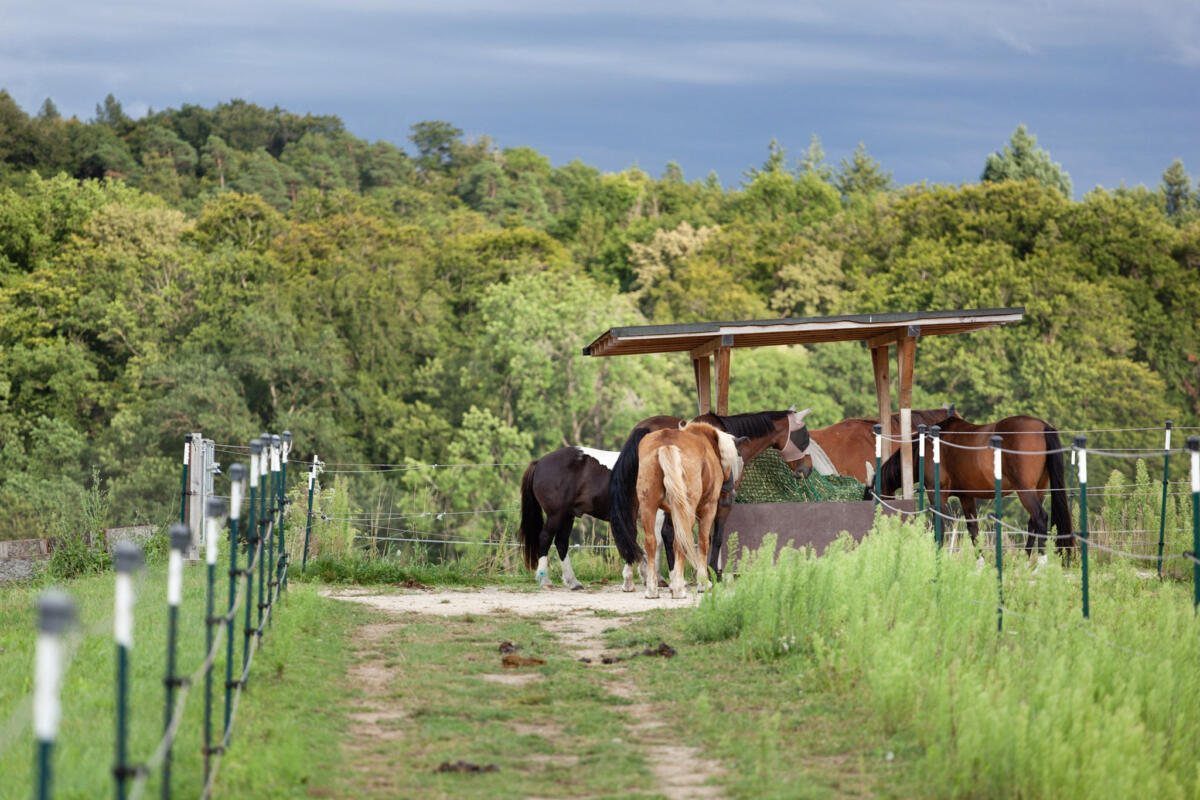 Seit Frühjahr 2023 gibt es auf unserer Anlage zusätzlich einen Rentnerstall. Dieser bietet 4 Pferden einen Platz im Offenstall mit Trail.