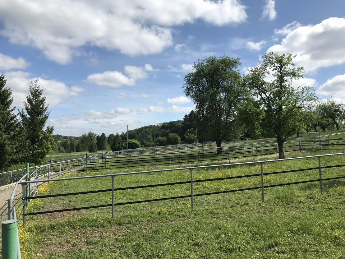 Für Rentnerpferde, Rekonvaleszente und Zuchtstuten steht ein separater Offenstall mit 10ha Weidefläche zur Verfügung.