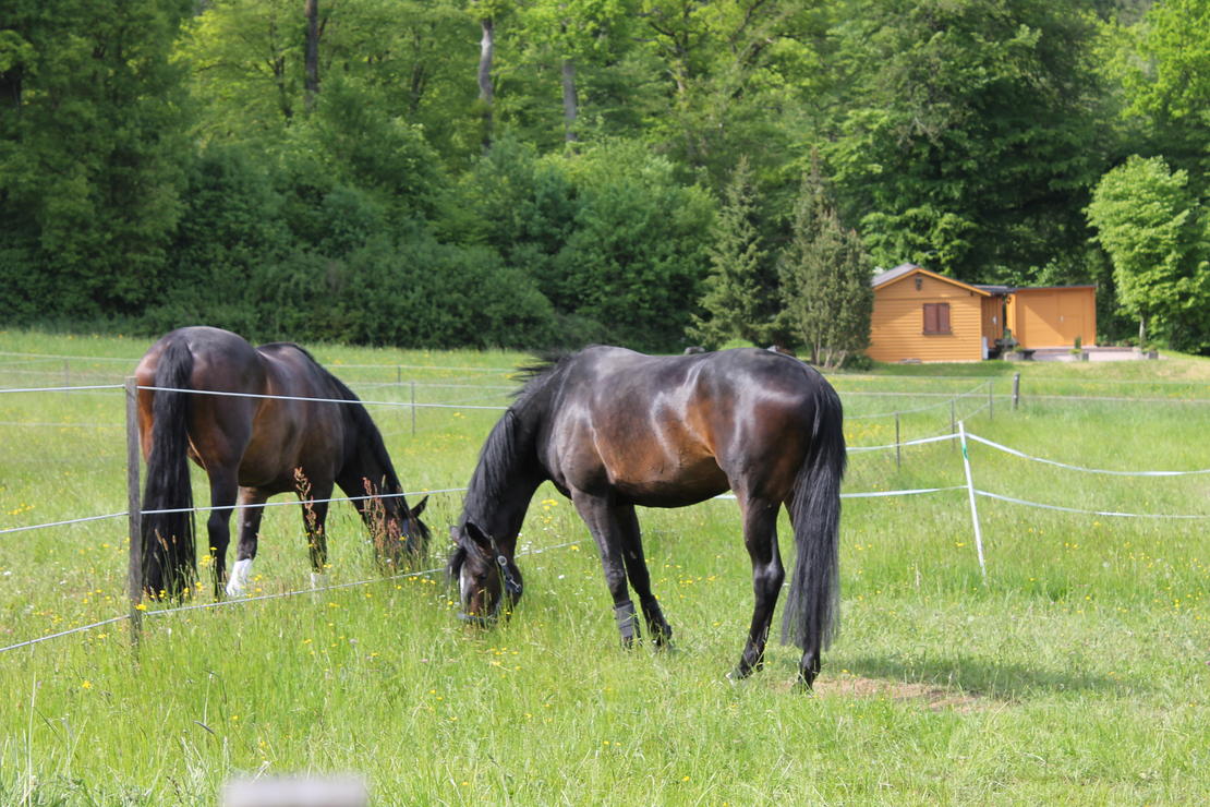 Ebenso steht ihnen ein 30x60m großer ins Tal gerichteter Außenplatz zur Verfügung. Selbstverständlich auch mit Terratexboden. Es steht eine Überdachte Führanlage für 6 Pferde bereit. Zur Anlage zählen 11 Koppeln die mit Patura-Weide-Zäunen gesichert sind.