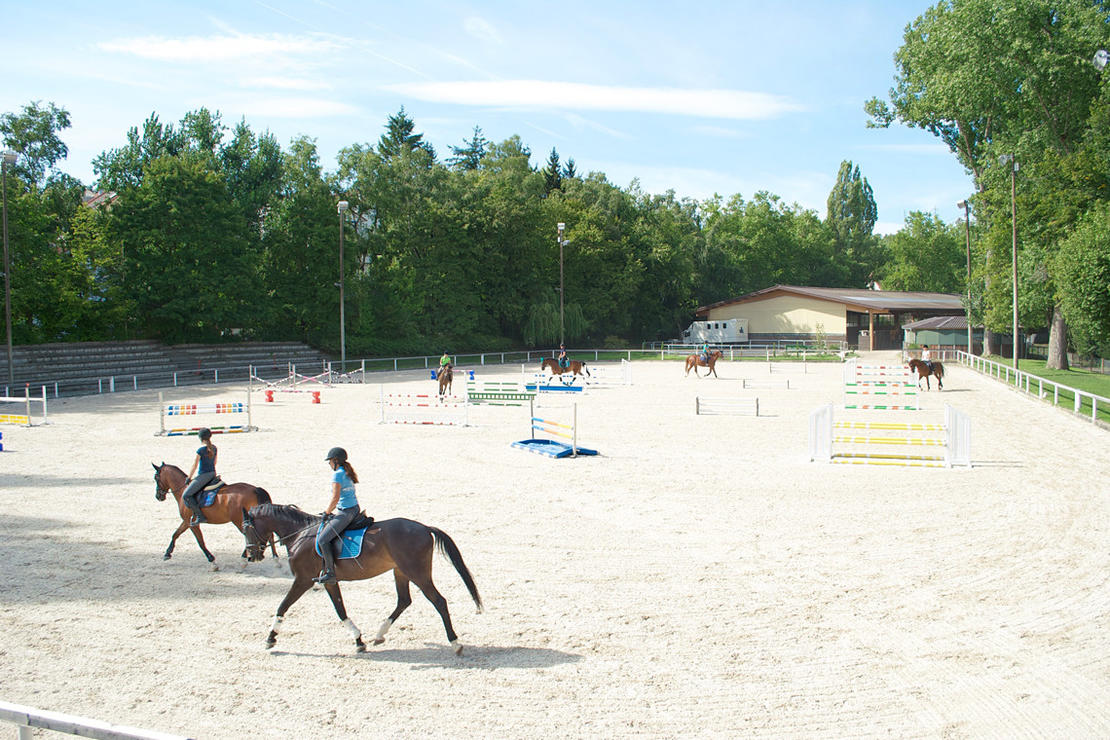Zentral auf der Anlage liegt der weitläufige Sandplatz (ca. 50 x 75 m), dieser ist ausgestattet mit einer Flutlichtanlage, einem Spiegel und einem Terra-Tex-Belag.