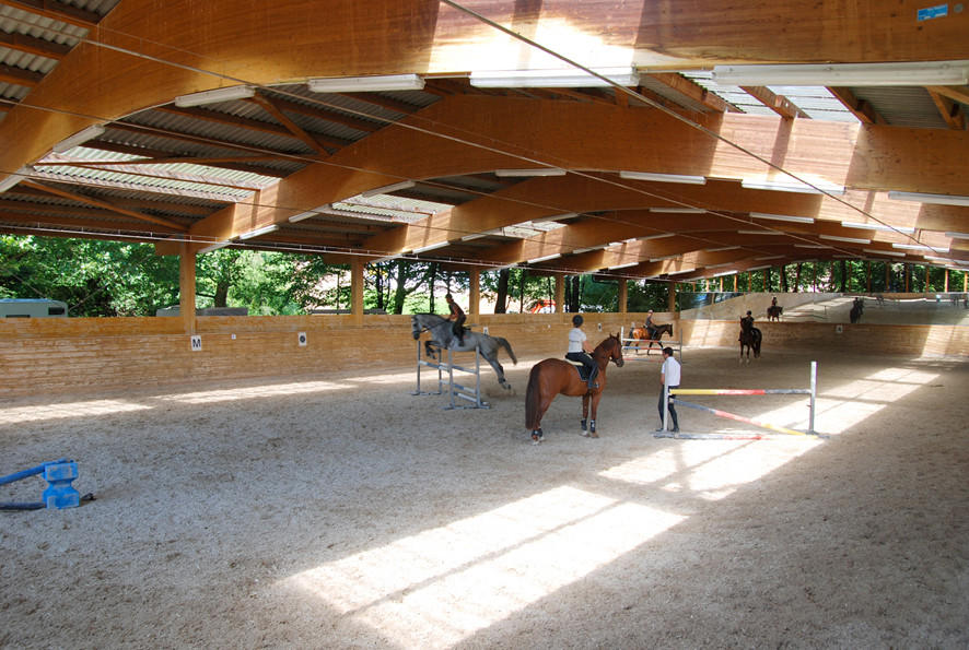 Hinter dem Sandplatz befindet sich die große Reithalle (20 x 60 m), welche ebenfalls mit einem Terra-Tex-Geläuf versehen ist.