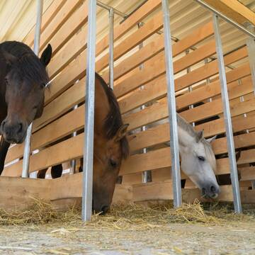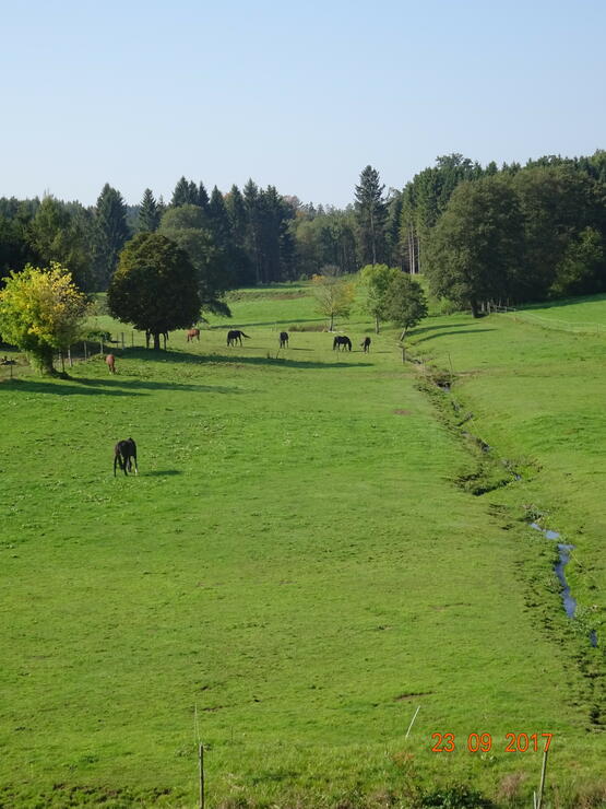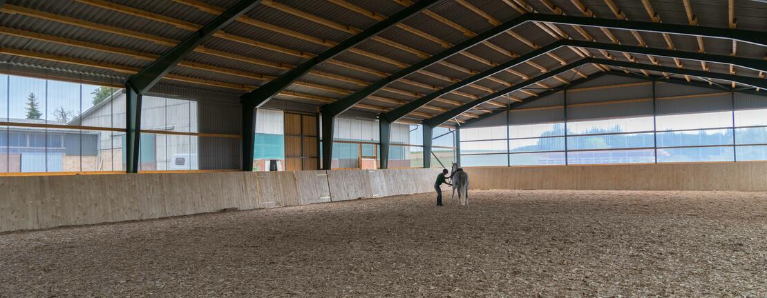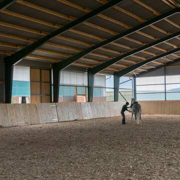 2018 neu erstellt ist unsere Anlage ein Paradies für Pferde und Reiter. Herrliches Ausreitgelände direkt am Stall und die große, helle, Reithalle sind Luxus pur für den Reiter, da bei uns die Halle nicht durch Unterrichtszeiten komplett blockiert wird. Die Bedürfnisse der Pferde werden bestens befriedigt durch strikte Trennung der Funktionsbereiche Fressen, Saufen, Bewegen, Ruhen und jeder Menge Platz. Dadurch herrscht große Ruhe in den Herden (eine Wallach- sowie eine Stutenherde) Unsere riesigen, gepflegten Weiden sowie die hellen großzügigen eingestreuten Stallungen und Futterbereiche lassen jedes Pferdeherz höher schlagen. Aber besonders auch im Winter genießen die Pferde die Bewegung an der frischen Luft, Sozialkontakte und Sonnenbaden... Durch die geschickte Anordnung der Gebäude finden sich viele Rückzugsbereiche für jedes einzelne Pferd. Bei der Ausbildung von Pferd und Reiter haben wir uns darauf spezialisiert "ganzheitlich" auszubilden, unter ganz besonderer Berücksichtigung der Gesunderhaltung bzw. Wiederherstellung der Gesundheit des Pferdes als auch des Reiters. Herrliches riesiges Ausreitgelände direkt ab Hof und ein eigener Wassereinritt machen das Reiterlebnis perfekt. Da wir nur 25 Pferde beherbergen ist es bei uns sehr ruhig und privat und die kleine Stallgemeinschaft ist zwar relativ lose, aber sehr nett ,offen und unkompliziert. Hier wird ein freundlicher Umgangston gelebt. Sowohl unter den Menschen,als auch zwischen Mensch und Pferd.