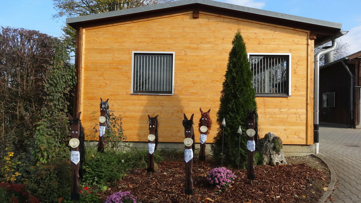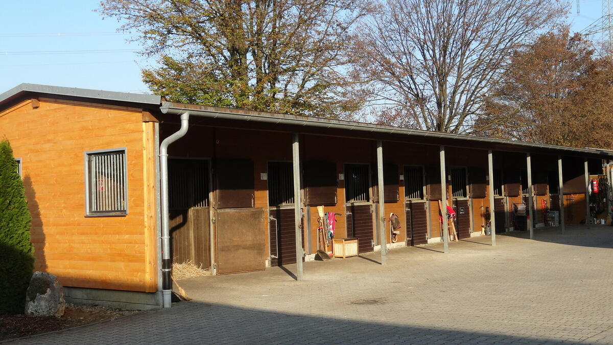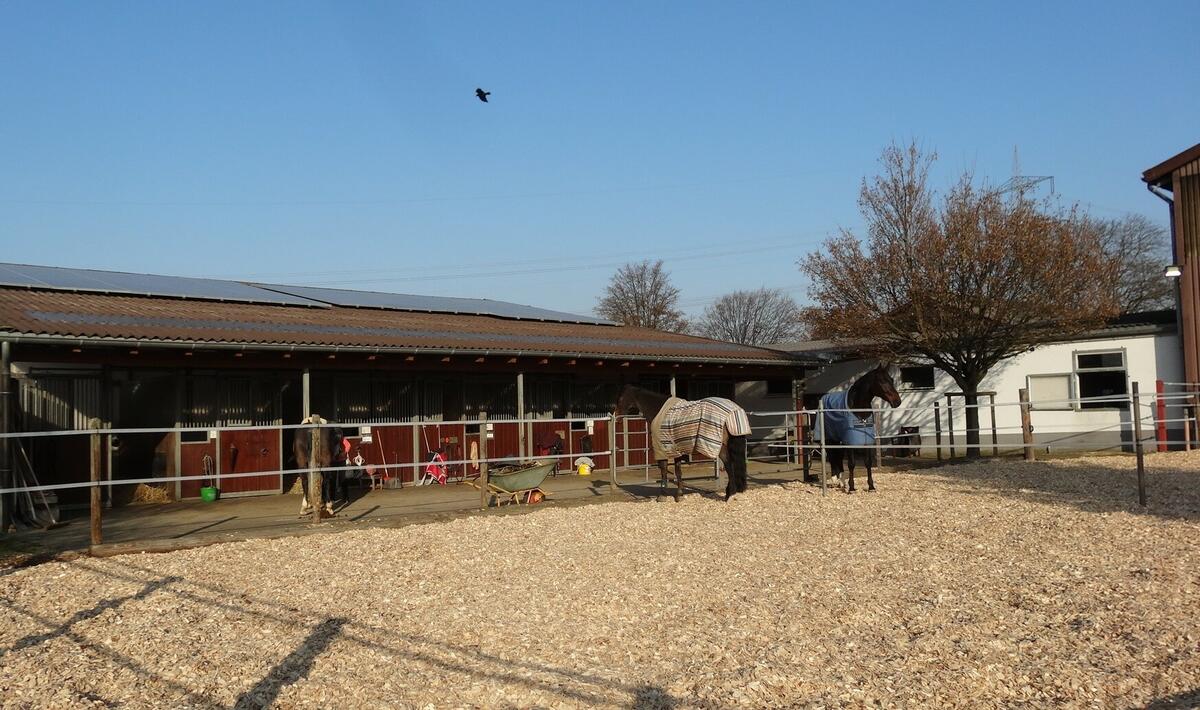 Außenboxinkl. 3x tägl. Fütterung von Rau- und Kraftfutter aus eigener Produktion, Weide, ganzjähriger befestigter Auslauf und Reitanlage. |