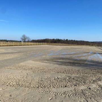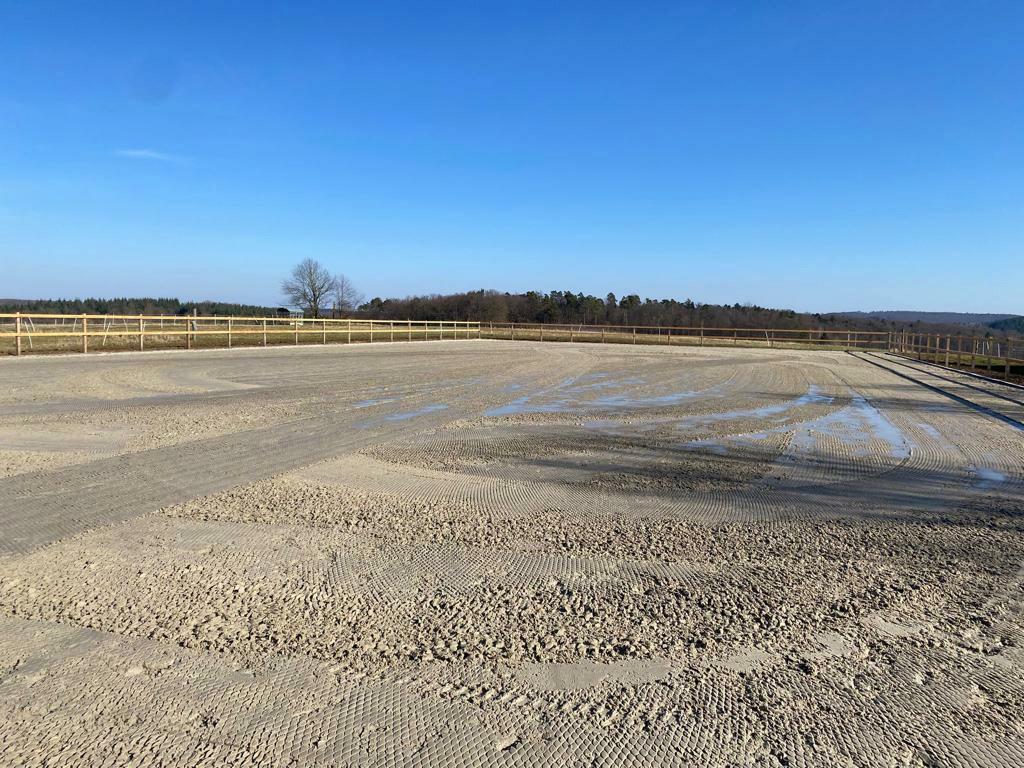 Eine gepflegte, helle und luftige Reithalle (20m x 40m), ein überdachter Longierzirkel, ein Sandplatz mit Flutlicht als Allwetterauslauf und ein Reitplatz (30m x 60m) stehen zur Verfügung.