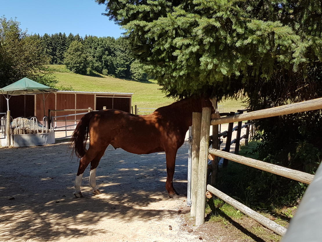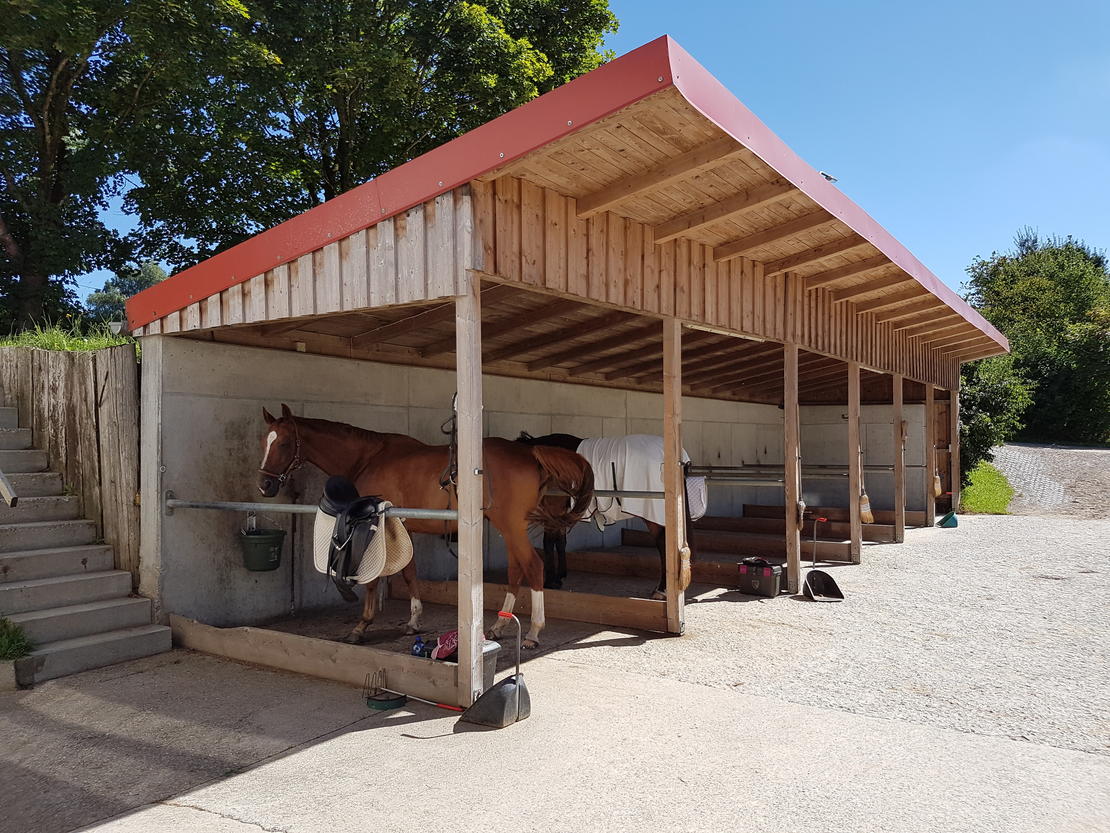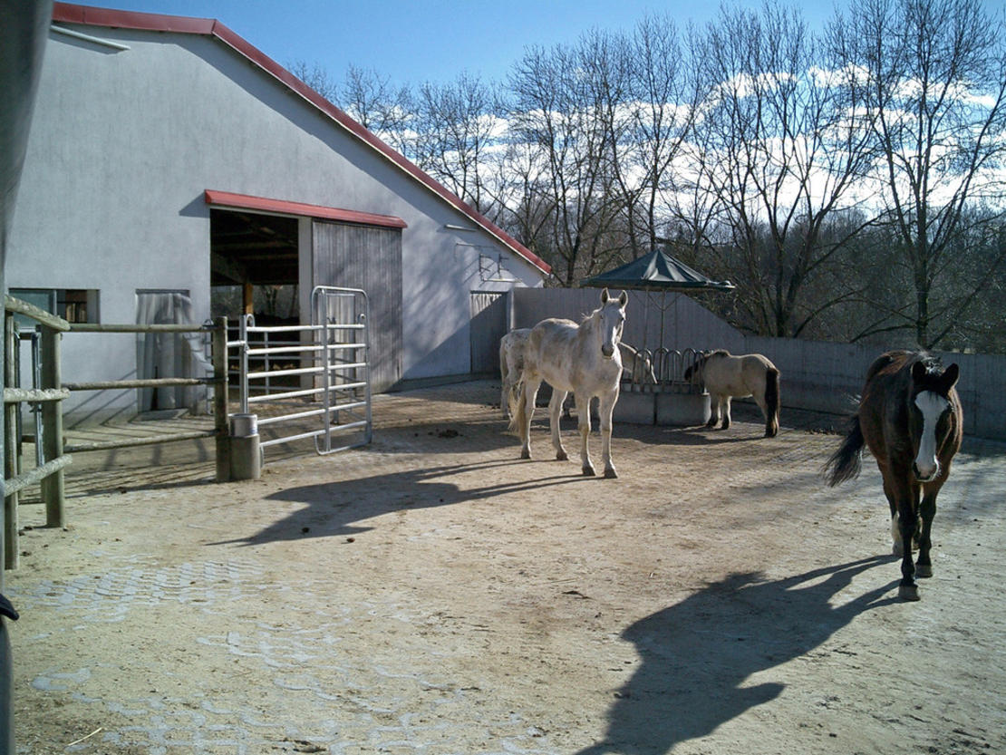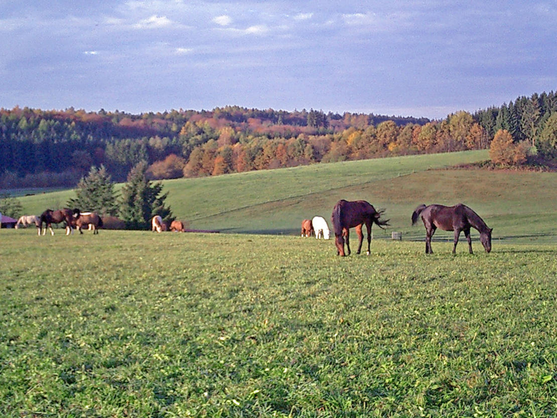 Seit dem Umbau des Haldenhofes im Jahr 1995 zum Offenstall / Bewegungsstall können wir nun auf fast 30 Jahre Erfahrung in der artgerechten Pferdehaltung zurückblicken. Die Lage des Haldenhofes am westlichen Ortsrand von Aystetten ermöglicht eine Arrondierung der Koppelflächen fast um den ganzen Hof herum. Unsere Pferde bewegen sich in zwei Herden, einer reinen Wallachherde und einer gemischten Herde. Pro Herde gibt es 3 Koppeln mit jeweils ca. 3ha Fläche. Die Koppeln werden abwechselnd genutzt, mal als Pferdeweiden, mal als Heuwiesen. Fast ein Drittel des Jahres bleibt jede Koppel geschont. So können die Pferde auch im Winter raus auf die Weide. Dank noch zusätzlicher Grünflächen können wir den größten Teil unseres Pferdeheus selbst produzieren. Unsere weitläufigen, mit unterschiedlichen Untergründen befestigten Auslaufbereiche und die mit Stroh eingestreuten großzügigen Liegehallen bieten ausreichend Platz für ca. 25 Pferde pro Herde. Heu wird je Herde in drei großen Rundraufen ad libitum angeboten. Heunetze über den Raufen verlängern die Beschäftigungs- und Fresszeiten. Ihre individuelle Kraftfutterration (zwei verschiedene Sorten) können sich die Pferde an einer computergesteuerten Abrufstation über den Tag verteilt selbst abholen. Wasser gibts an pro Herde 4 beheizten Tränken. Spielen, Ruhen, Fressen, Trinken: die Aufteilung der Flächen in verschiedene Lebensbereiche ermöglicht den Pferden einen Tagesablauf ihren individuellen Bedürfnissen entsprechend im Wechsel zwischen Ruhe und Bewegung. Für kranke Pferde haben wir 4 Aussenboxen in einem separaten Stallgebäude, hier können auch tierärztliche Behandlungen durchgeführt werden. Windschutznetze an drei Seiten unserer mit ca. 25m x 55m sehr großzügigen Reithalle bewirken in der Halle ganzjährig ein helles und luftiges Klima. Der mit Flutlicht ausgestattete Außenreitplatz (15m x 30m) kann ganzjährig beritten werden. Dank der Ortsrandlage können die Reiter direkt vom Hof ins Gelände reiten. Wer nur eine "kleine Runde" drehen will , kann den eigens dafür angelegten, ca. 5 km langen Reitweg rund um die Koppeln nehmen. Ausrüstung, Sättel und Decken sind in beheizten und abschliessbaren Sattelkammern untergebracht, außerdem gibt es Platz für zusätzliche Futtertonnen etc. In der großen Waschbox für beide Herden gibt es ganzjährig warmes Wasser, hier ist auch ein Pferdesolarium. Für die Reiter haben wir eine gemütliche, kleine Reiterstube/Teeküche mit Terrasse eingerichtet, von der aus man wunderbar den Pferden zusehen kann. Es gibt zwei, nach Geschlechtern getrennte Toilettenräume. Für dieses Jahr sind nun alle Plätze belegt, wer Interesse hat, kann sich aber gerne trotzdem vormerken lassen.