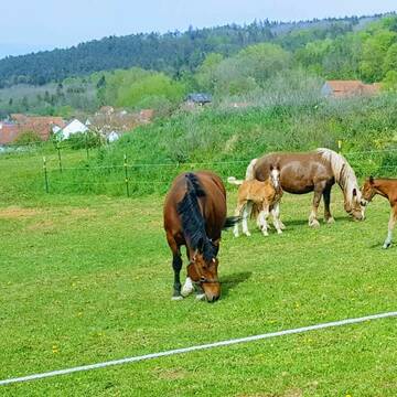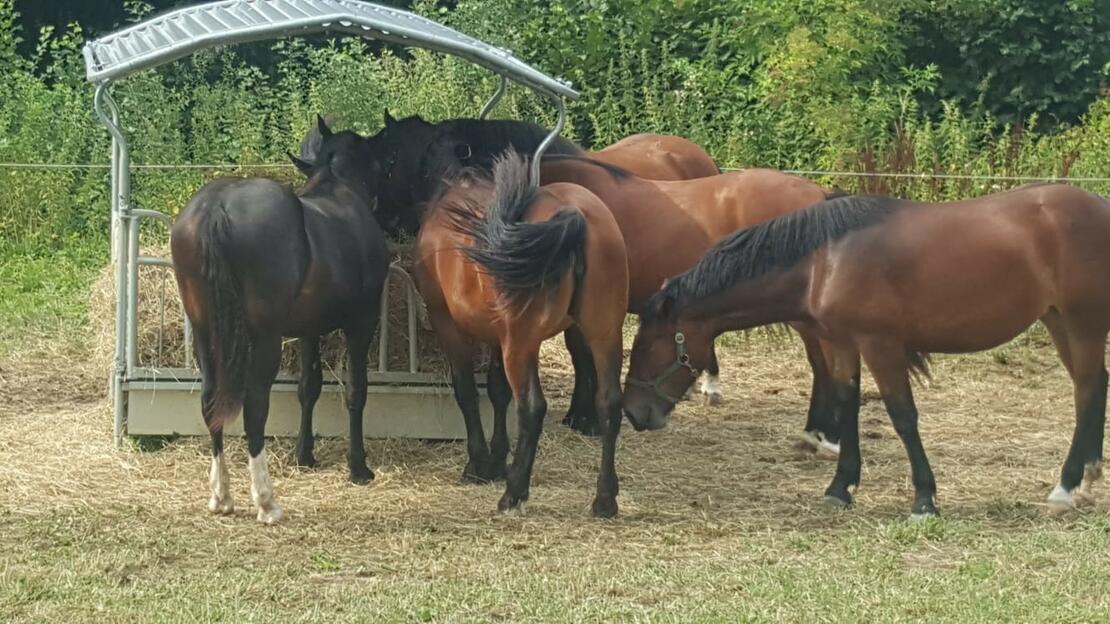 - sowie für Jungpferde zusätzliche Heuraufen und Unterstand auf der Wiese die Tag und Nacht im Sommer drausen sind.