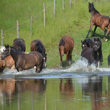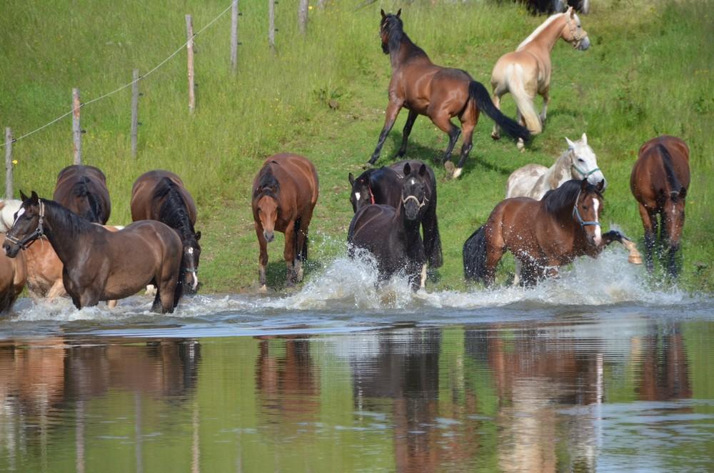 Stallboxenplätze, täglicher Weidegang, fließend Wasser auf allen Weiden, großzügige Ausrittmöglichkeiten in den nahegelegenen Wäldern, Heuwagen auf den Weiden, im Sommer 24H Außenhaltung bei schönem Wetter, Herdenhaltung, Sonnen- und Regenschutz auf den Weiden (ca. 120m² Halle),