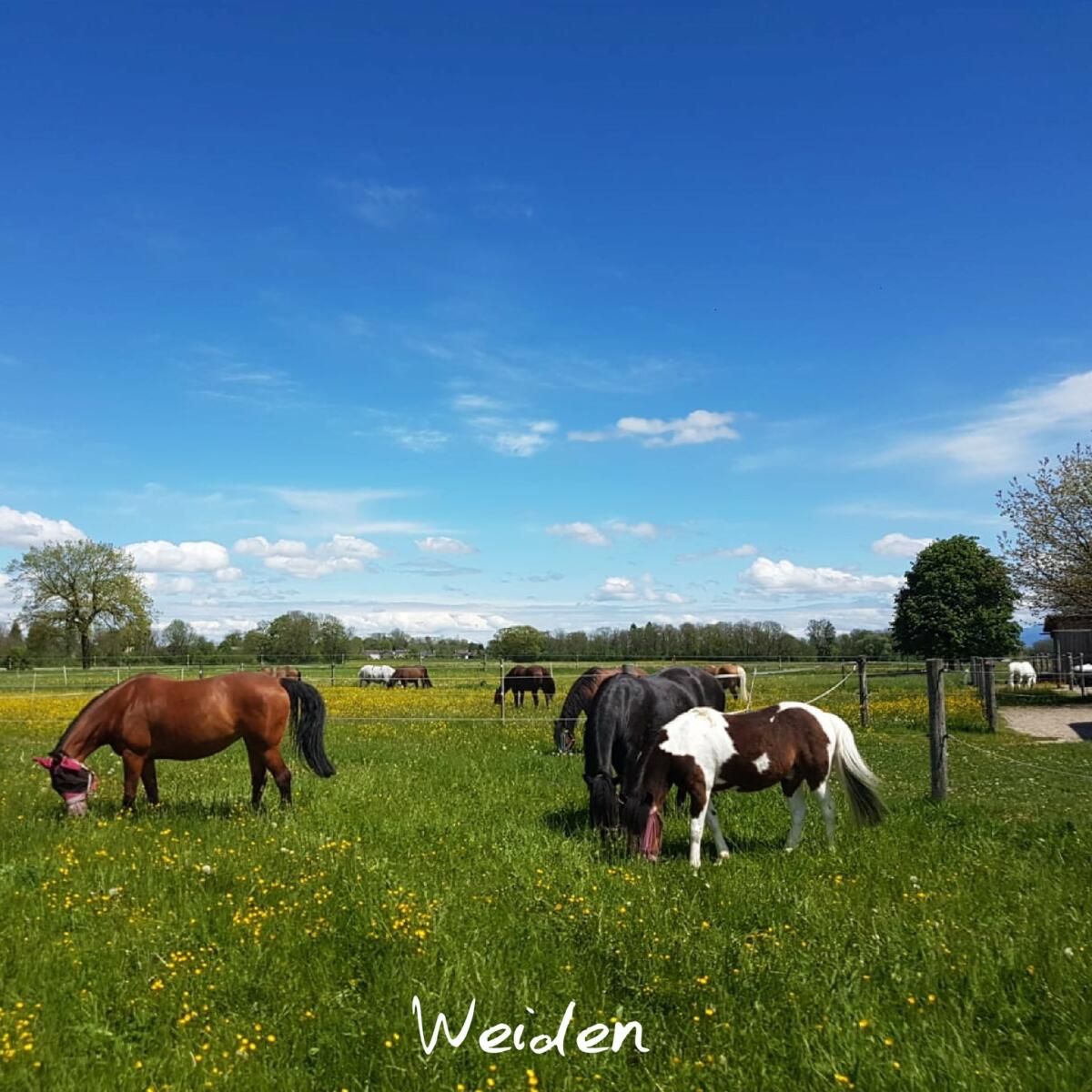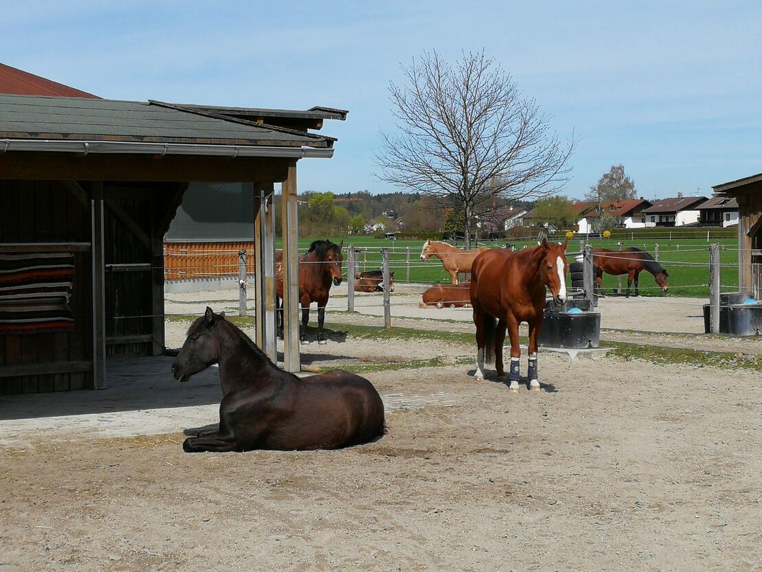 Für die Pferde im Paddock-Boxen-Stall: ° Die Pferde kommen täglich ab Vormittag in kleinen Gruppen (gemischte Herde) auf die großen Sandpaddocks ° stundenweiser Weidegang je nach Witterung ° Die Nacht verbringen die Pferde in ihrer Box. ° Wir füttern je nach Weidegang 3 x Heu, letzte Fütterung ca. 22:00 Uhr in den Boxen ° Zusatzfutter (nach der Raufuttergabe)