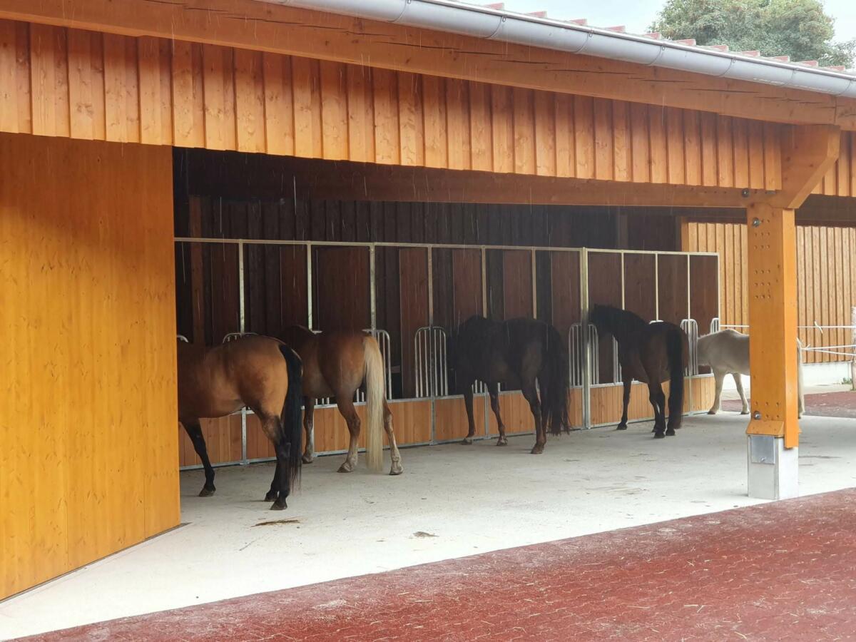 !!NEU!! Der Bewegungsstall bietet: ° großzügiger neuer Bewegungsstall für 10 leichtfuttrige Kleinpferde / Ponys mit dem Stockmaß ca. 1,25 m bis ca. 1,55m ° Pferdeschleuse zum sicheren Rein- und Rausbringen der Pferde ° Maßangefertigte Palisaden-Durchfressgitter in der Futterhalle und der Fresshütte ° Große Liegehalle ° Zwei große Integrations-Boxen / Kranken-Boxen mit beheizbarer Tränke ° Paddocktrail-Elemente ° Beheizte Doppelballtränke ° Verschiedene Bodenbeläge im Auslaufbereich (Unterbau Ecoraster) ° Wälzplatz ° Innen-Putzplätze ° extra beleuchteter Platz für den Schmied ° Außen-Waschplatz ° Futterkammer abschließbar ° Sattelkammer (beheizbar, mit Waschbecken und Wasserkocher), Jeder Einsteller bekommt seinen eigenen Spind ° Deckenhalterungen für Abschwitz- und Regendecken