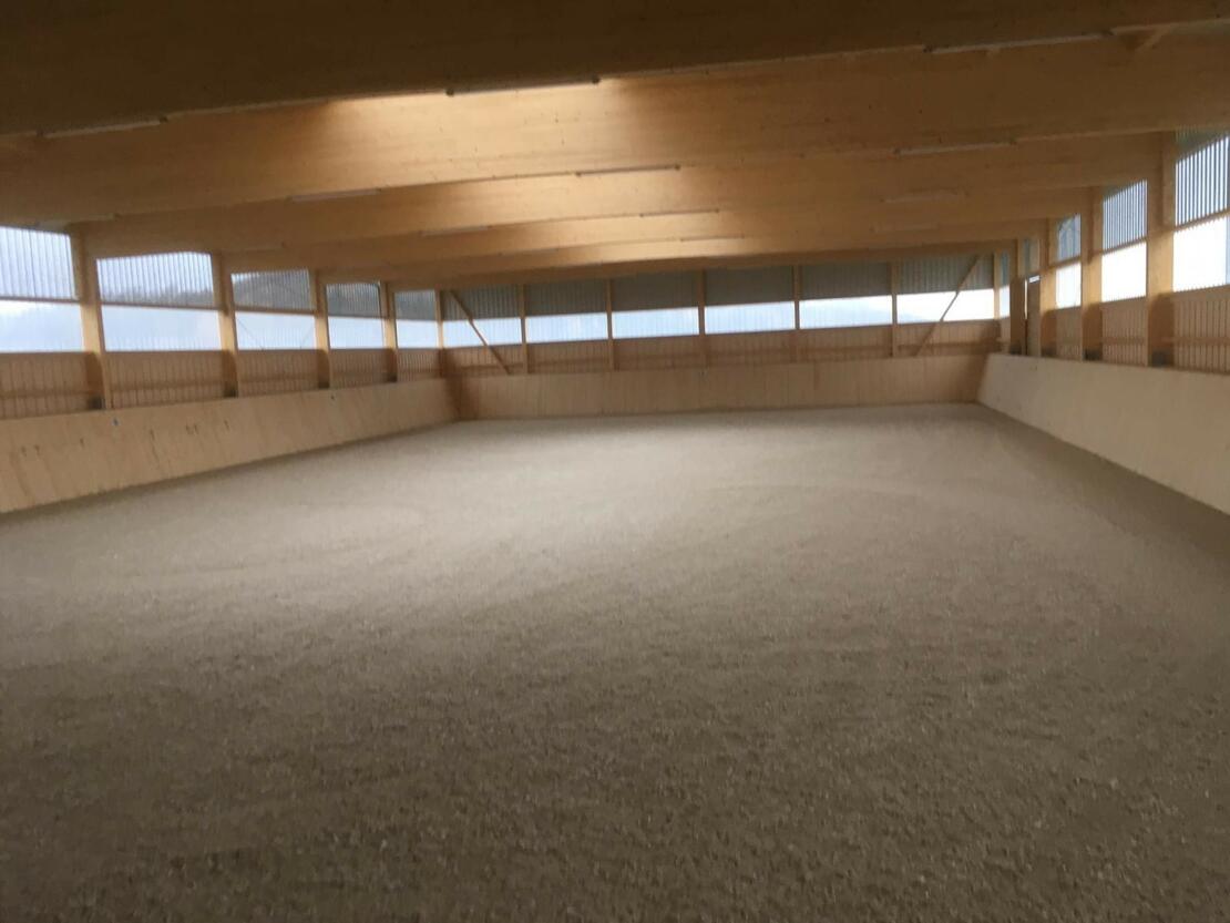 Unser kleiner Familienbetrieb verfügt über eine 2018 erbaute Reithalle (20 x 40m), einen kleinen Reitplatz, einen Pensionspferdestall mit 10 Paddockboxen, einen separaten Schulpferdestall und wunderschönes Ausreitgelände.