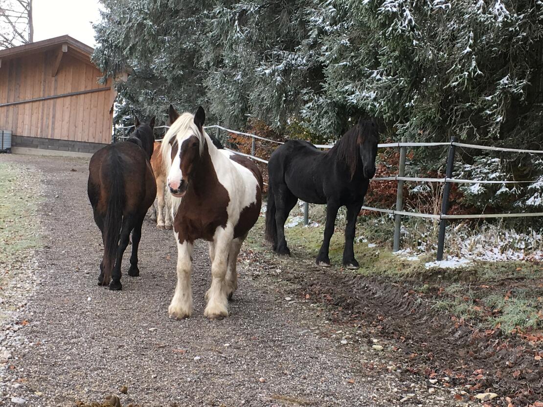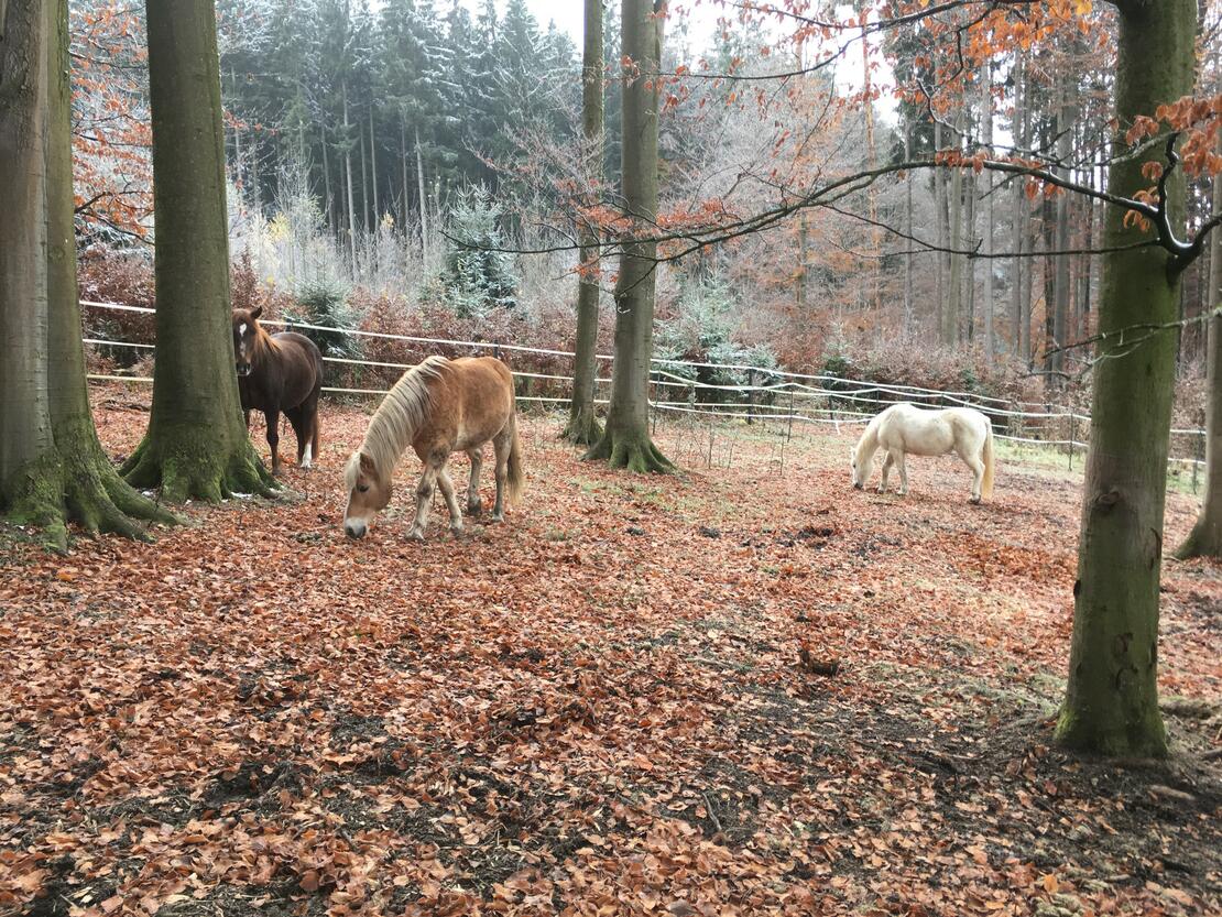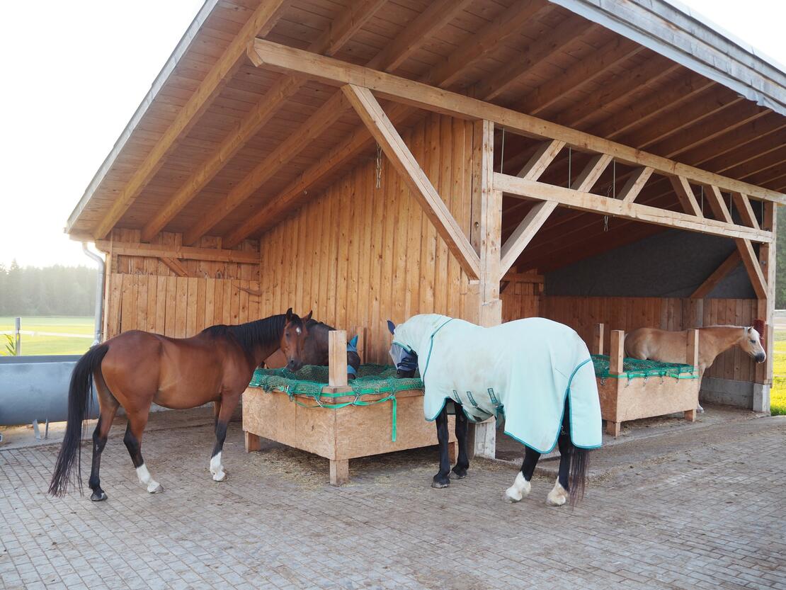 Wir bieten eine artgerechte Haltung mit 365 Tagen Auslauf im Jahr. Die Pferde leben ganzjährig in unserer großzügigen Paddock Trail Anlage. Es steht ihnen ein 500 Meter langer befestigter trail zur Verfügung, der auch im Winter trocken und einladend ist. Dort können sie zwischen den verschiedenen Stationen wie Heunetze, Tränke (beheizt), Schattenplatz im Wald, Wälzplatz und Wetterunterständen hin und her wandern. Ausruhen können sich die Pferde in unseren zwei Liegebereichen. Außerdem haben sie ständigen Zugang zu 2000 qm Wald und kommen während der Weidesaison täglich für eine begrenzte Zeit auf eine der Graskoppeln.
