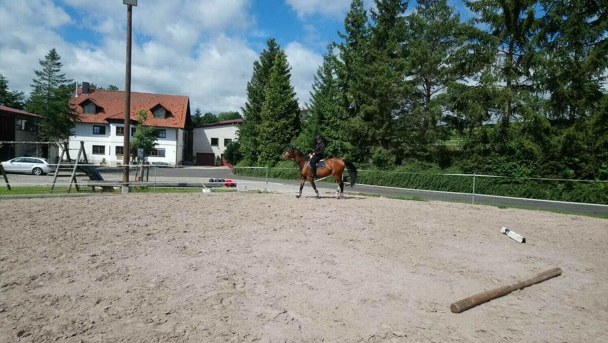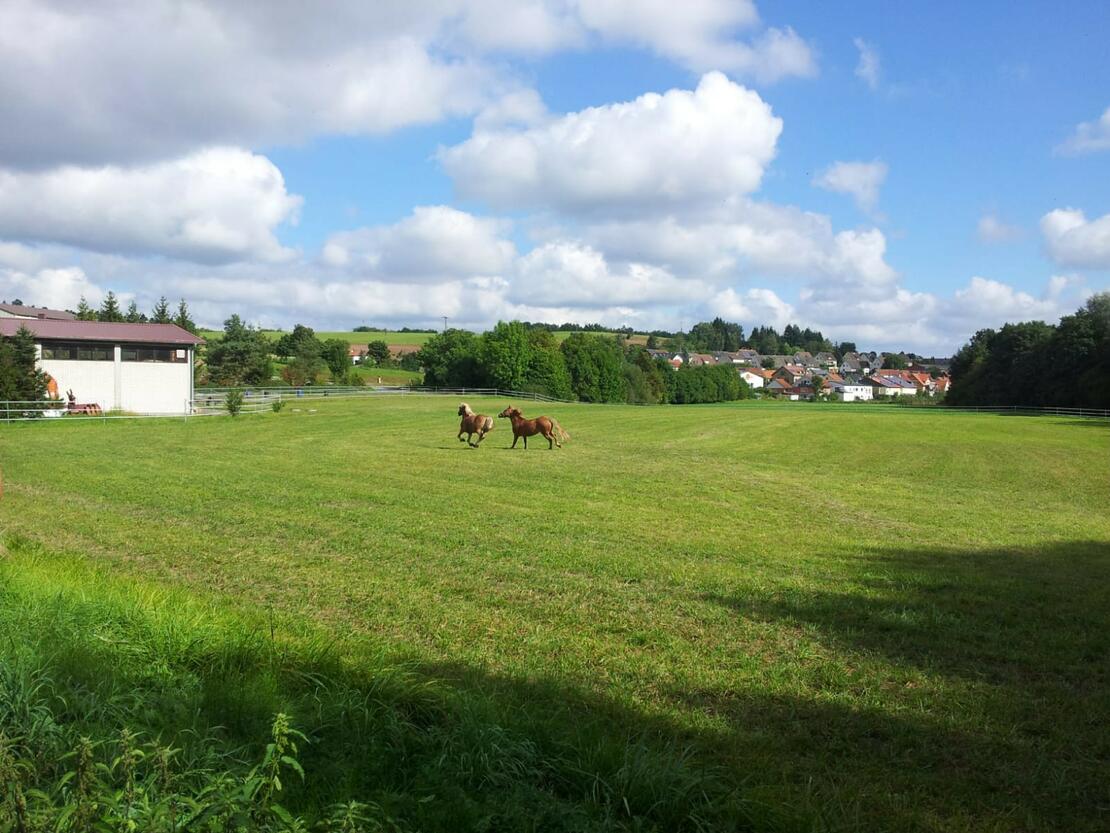Wird sind ein mittelständischer Pferdehof in den malerischen Haßbergen. Unser Hof wurde durch das Veterinäramt Haßfurt abgenommen und zertifiziert. Wir erfüllen somit alle Voraussetzungen für eine artgerechte Pferdehaltung. Die Hofleitung sowie unser Personal sind nach §11 Tierhaltungsgesetz geprüfte Pferdewarte. Großzügige Pferdeboxen garantieren eine individuelle Versorgung Ihres Pferdes. Ein gut durchlüfteter hoher heller Stall erzeugt ein gutes, nahezu staubfreies Stallklima. Unsere Wasserumlaufanlage ist frostgeschützt. Ein Warmwasserwaschplatz, sowie ein Paddockstall gehören ebenfalls zu unserer Anlage. 40000qm Weidefläche stehen für den täglichen Weidegang zu jeder Jahreszeit zur Verfügung. In der regenreichen Zeit verbringen unsere Pferde ihren Auslauf auf 500qm Paddockflächen. Unser gemütliches Reiterstübchen sowie die Sattel- und Geschirrkammer sind beheizt. Ein kleines Bad mit Dusche steht ebenfalls zur Verfügung. Im Außenbereich haben wir einen Lagerfeuer- und Grillplatz. Bei uns können Sie auch bei ihrem Pferd wohnen, denn wir haben eine große Ferienwohnung. Unser 50x20m großer beleuchteter Reitplatz besitzt eine Deckschicht aus speziellen Reitplatzsand und wird täglich abgezogen. Sprunghindernisse stehen zur Verfügung. Die Boxen werden täglich gemistet. Es sind keine Stalldienste notwendig. Anweiden sowie Koppelgang wird von uns übernommen. Unsere Pferde bekommen mehrmals täglich Heu. Es wird mit Stroh eingestreut was auch die Rauhfutterversorgung sicherstellt. Kraftfutter beziehen wir im Bigbag und kann auf Wunsch zugefüttert werden. Haben wir Ihr Interesse geweckt, dann schreiben Sie uns. Bitte nur mit Namen und e-Mail Adresse oder Telefonnummer. Anonyme Anfragen werden nicht beantwortet.
