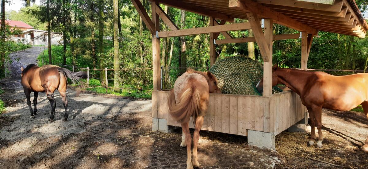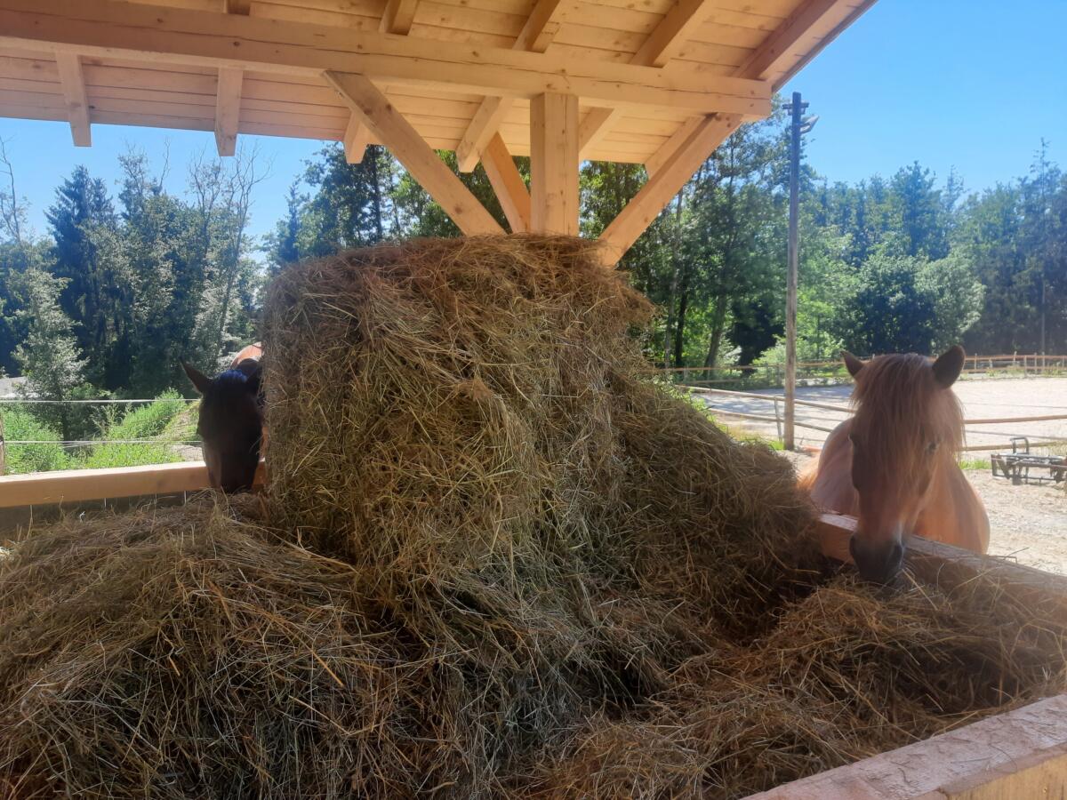 - Bedarfsgerechte Fütterung, zeitgesteuerte Heuschieber. KEIN zahnschädliches Heunetz für das Hauptfutter.