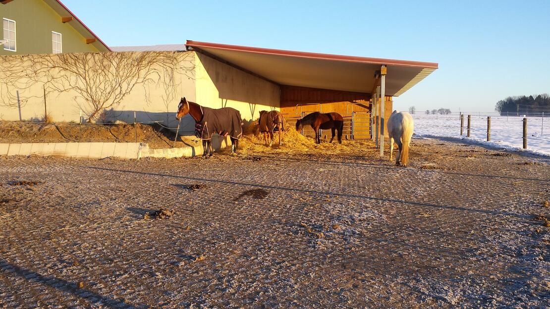 Offenstall mit 24 Stunden Heuzugang und Stroheinstreu, befestigte Paddocks, kein Schlamm.