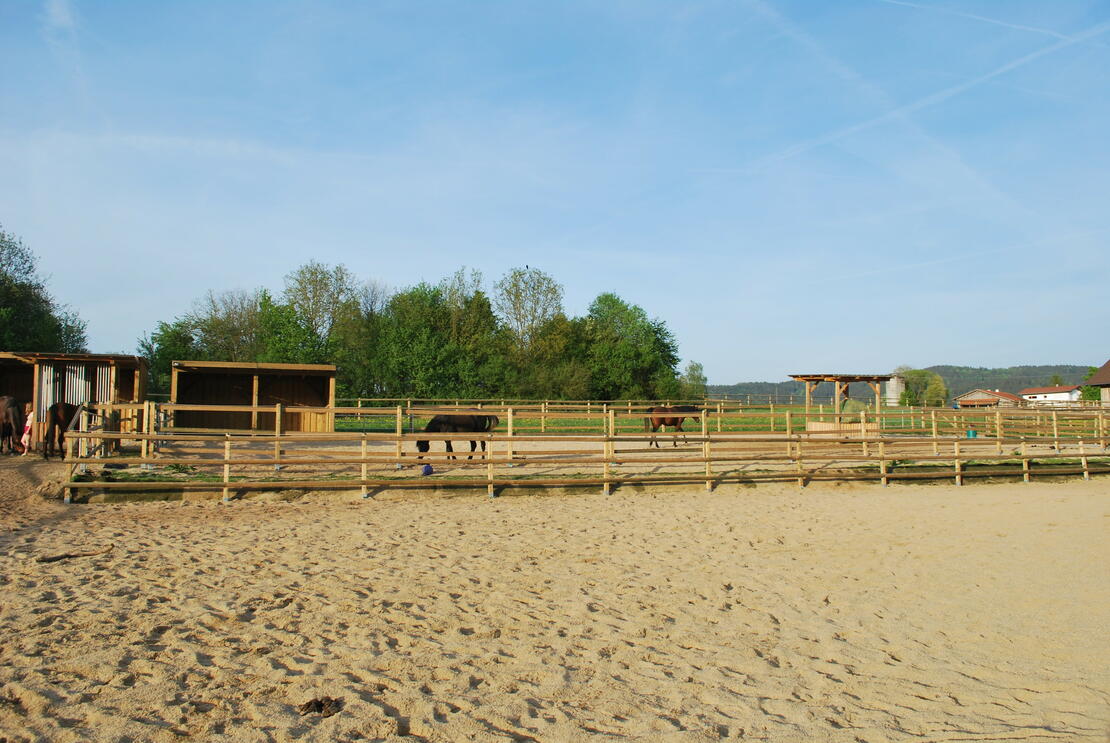 Unsere Reitanlage liegt im idylischen, vorderen Bayerischen Wald und verfügt über gute Verkehrsanbindung. Unseren Pferden stehen großzügige, befestigte Sandausläufe mit ständigem Zugang zu Heu bester Qualität, frischem Wasser und Unterständen zur Verfügung. Im Sommer steht es den Pferden offen, auf große Weidefläche, welche sich direkt an die Sandausläufe anschließen, zu grasen. Im Sommer, während der großen Mittagshitze und im Winter in der Nacht, können die Pferde (wenn es vom Besitzer gewünscht wird) in großzügigen Boxen im luftigen Stallgebäude untergebracht werden. Die Fütterung des Kraftfutters erfolgt zweimal täglich. Den Pferden steht ausreichend Heu ad libitum in Heunetzen zur Verfügung. Zur Bewegung der Pferde ist unsere Reitanlage mit einem 20x40m beleuchteten Sandplatz, einem Anhängerübungsplatz für die Bodenarbeit und erstklassigem Ausreitgelände ausgestattet. Die Reiter können sich nach dem Training im Aufenthaltsraum erholen, der einen herrlichen Blick auf die Auslaufflächen bietet. Dieser ist überdies ausgestattet mit WC, Dusche, Sattelkammer, Kühlschrank und Kaffeemaschine. An sonnigen Tagen können Reiter und Interessierte das Training auf dem Reitplatz von einem kleinen Garten mit Sitzgelegenheit aus verfolgen.