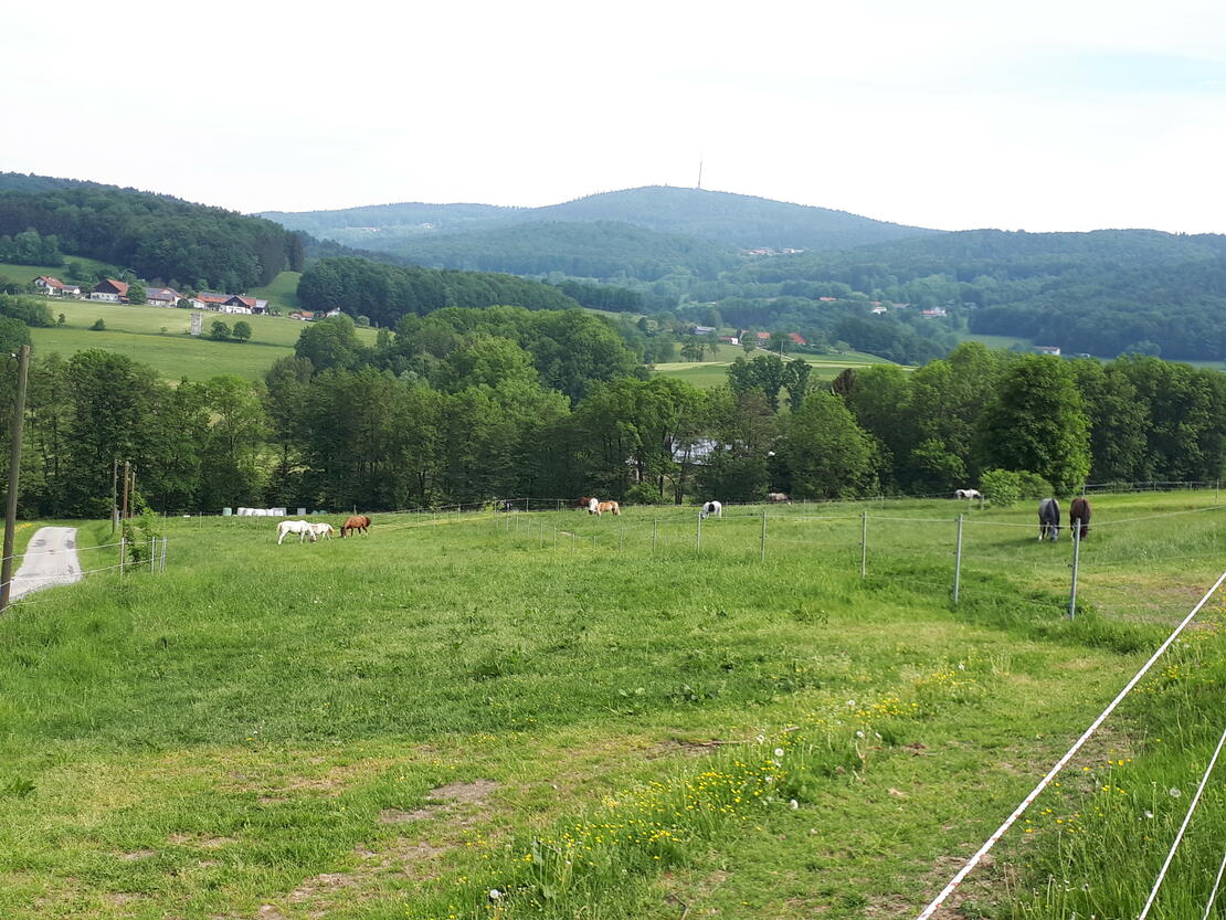 Offenstall/ Weideplatz8 Hektar große WeideWeidehütte mit fließend Wasser Fressplatz mit Futterraufe |