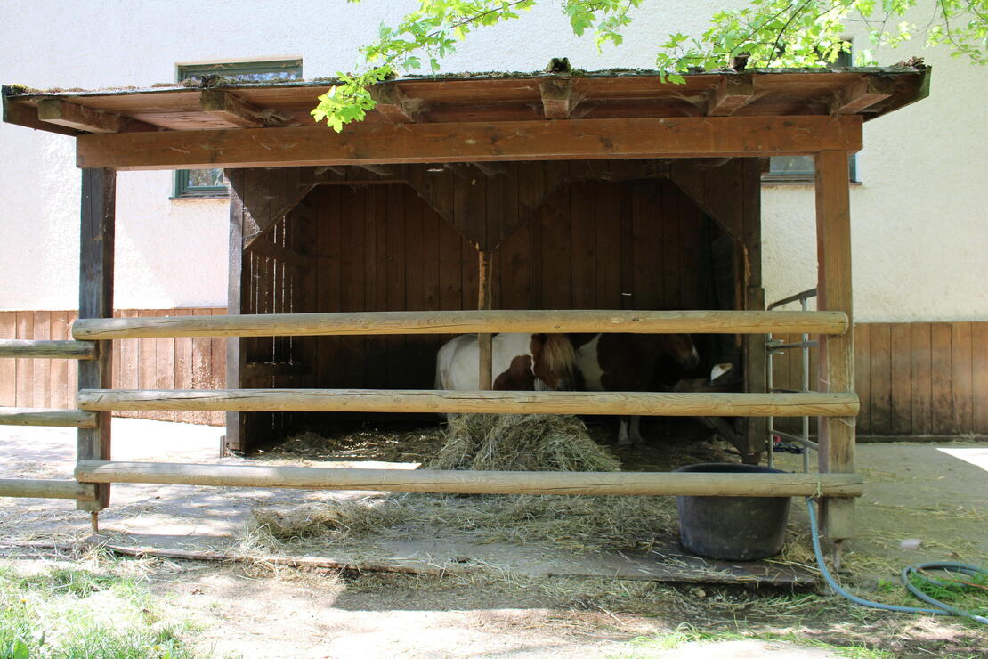 Die Offenstall-Herden sind nach Stuten/Wallachen getrennt. Hier gibt es einen großen Unterstand mit beheiztem Tränkebecken und einer Heuraufe mit 24/7 Heu, ein große Bewegungsfläche und ebenfalls Sommerweiden.