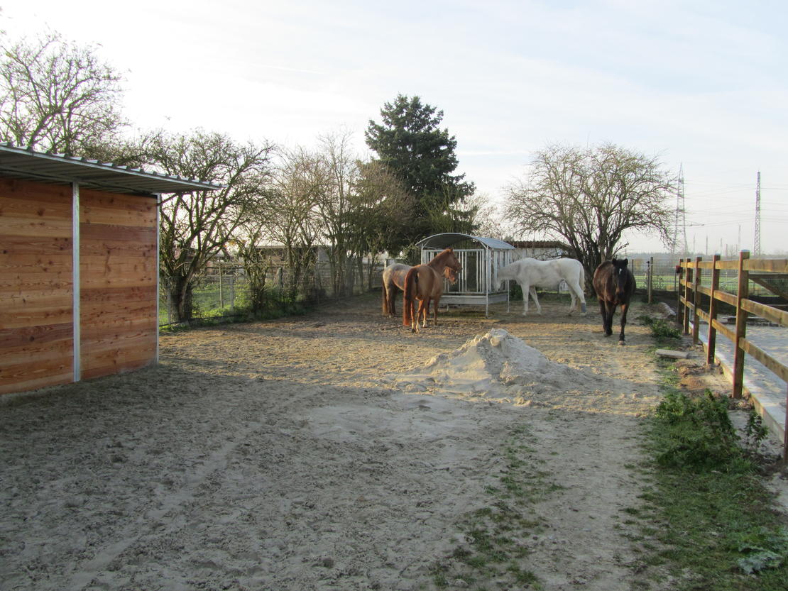 Ein Rundlauf rund um den Reitplatz, Heu ad lib über zwei auf der Fläche verteilte Heuraufen und frostsicheren Tränken dienen durch Ihre Anordnung als Bewegungsanreiz für die Pferde.