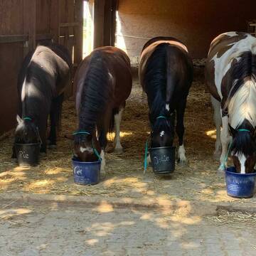 Alle Pferde auf unserer Anlage stehen im Offenstall. Damit Ärger und Drängeleien weitgehend vermieden werden können, haben wir Gruppengrößen von 3-6 Pferden. Die Fütterung des Kraftfutters wird von uns 2x/tägl.übernommen. Gerne können unserer Einsteller die individuellen Rationen und Zusätze für ihre Pferde vorbereiten und bereitstellen. Auf jedem Paddock steht eine große Heuraufe die immer gefüllt ist, so haben die Pferde immer etwas zu knabbern. Für den Durst stehen frostsichere Tränken zur Verfügung! Ebenfalls hat jeder Paddock (der Dank des tollen Weiterstädter Sandes meistens matschfrei ist) ausreichend Unterstände, damit alle Pferde Platz zum Zurückziehen und Ausruhen haben. Während der Weidesaison kommen die Pferde tagsüber stundenweise auf die angrenzenden Weiden. Unsere Einsteller können wählen, ob sie für die Entmistung selbst verantwortlich sind, oder wir das gegen einen Aufpreis übernehmen sollen.