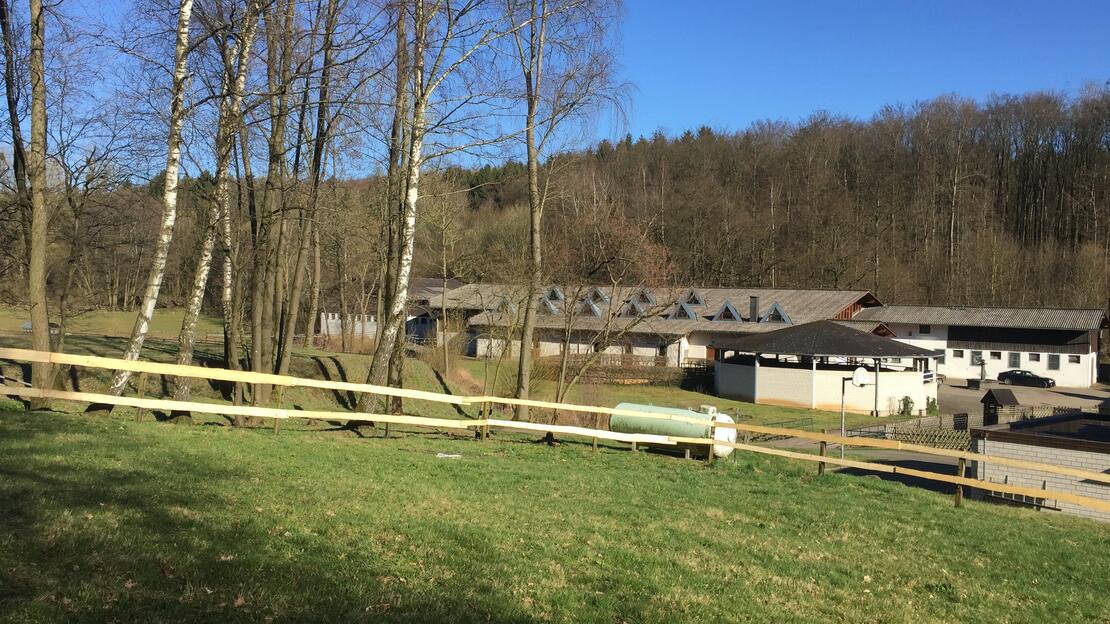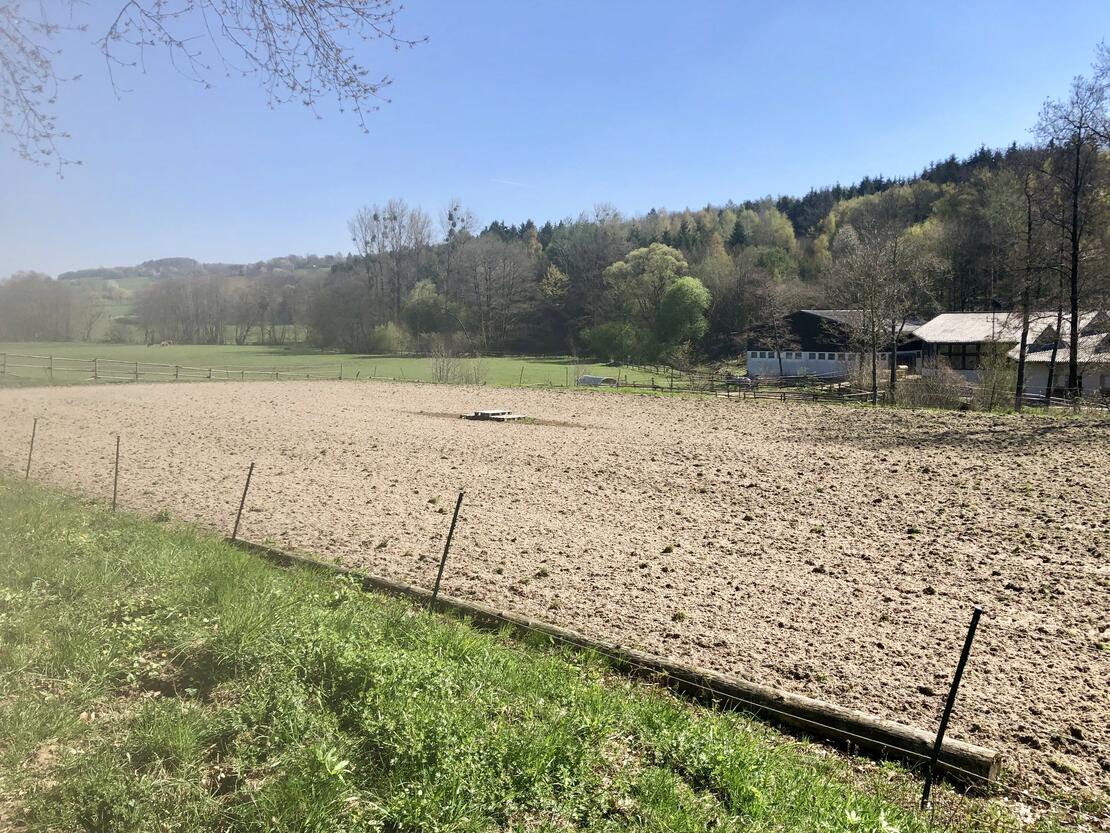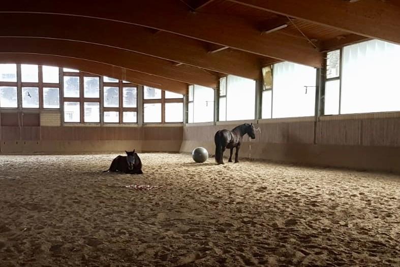 Daneben bieten wir noch einen separaten Paddocktrailbereich an. Hier leben 6 Pferde in einer gemischten Herde. Auch hier wird Heu ad libitum gefüttert. Die Pferde haben ganzjährig Zugang zu einer großen Koppel - ebenso stehen Reithalle und Außenreitplatz zur Verfügung.