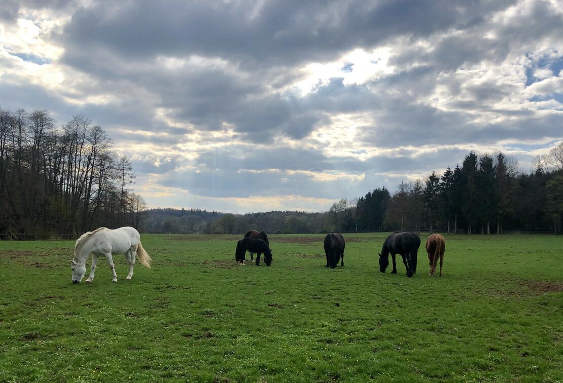 Unsere Freizeitpferde - alle barhuf - leben in zwei kleinen alters- und geschlechtsgemischten Herden . Im Offenstallbereich sind die Pferde tagsüber stundenweise auf grossen Koppeln, nachts in offenen Aussenboxen mit Gemeinschaftspaddock. Wir füttern Bio Heu ad libitum, misten 2 x täglich, bieten Salz- und Minerallecksteine an und haben für unsere Freizeitreiter Reithalle, Außenreitplatz, Roundpen und ein schönes Gelände zum Ausreiten