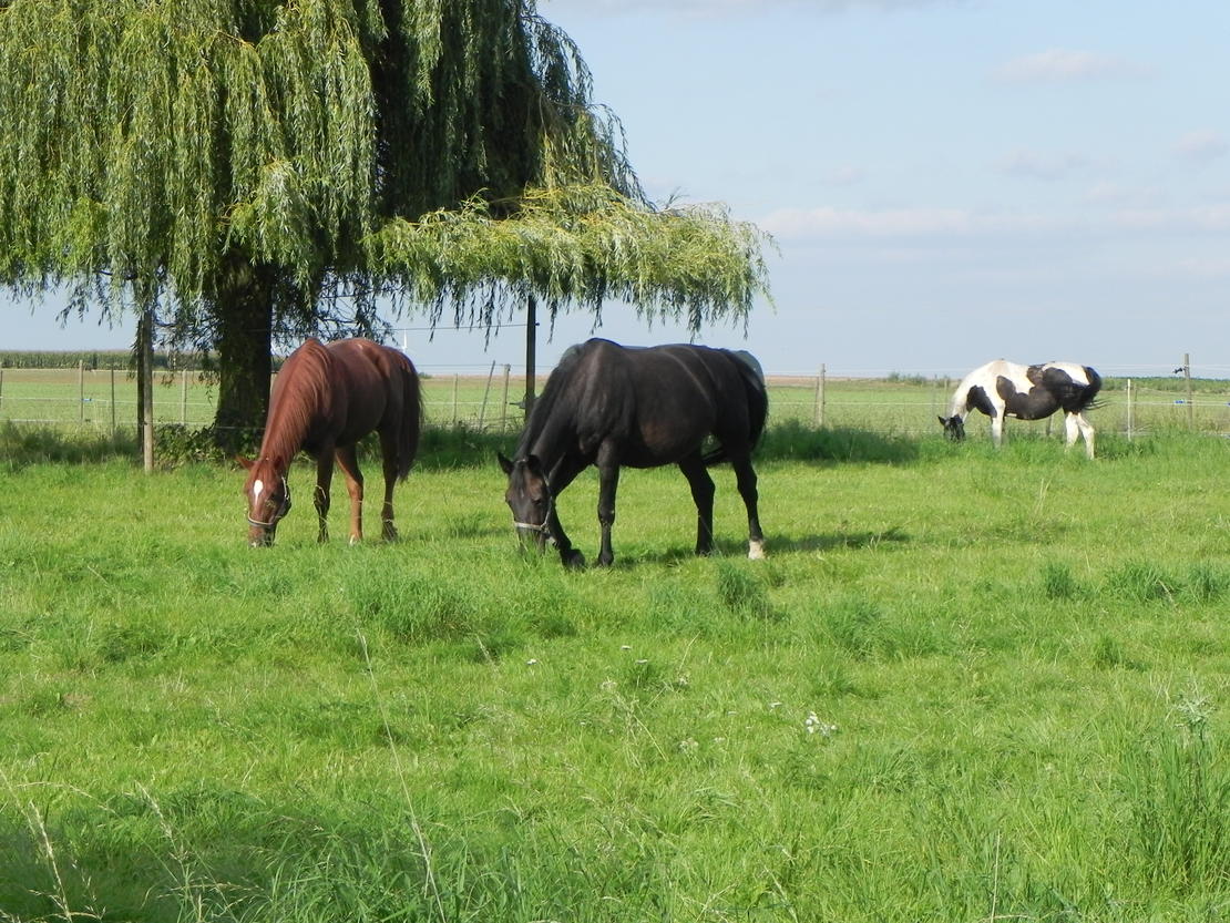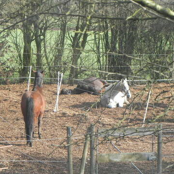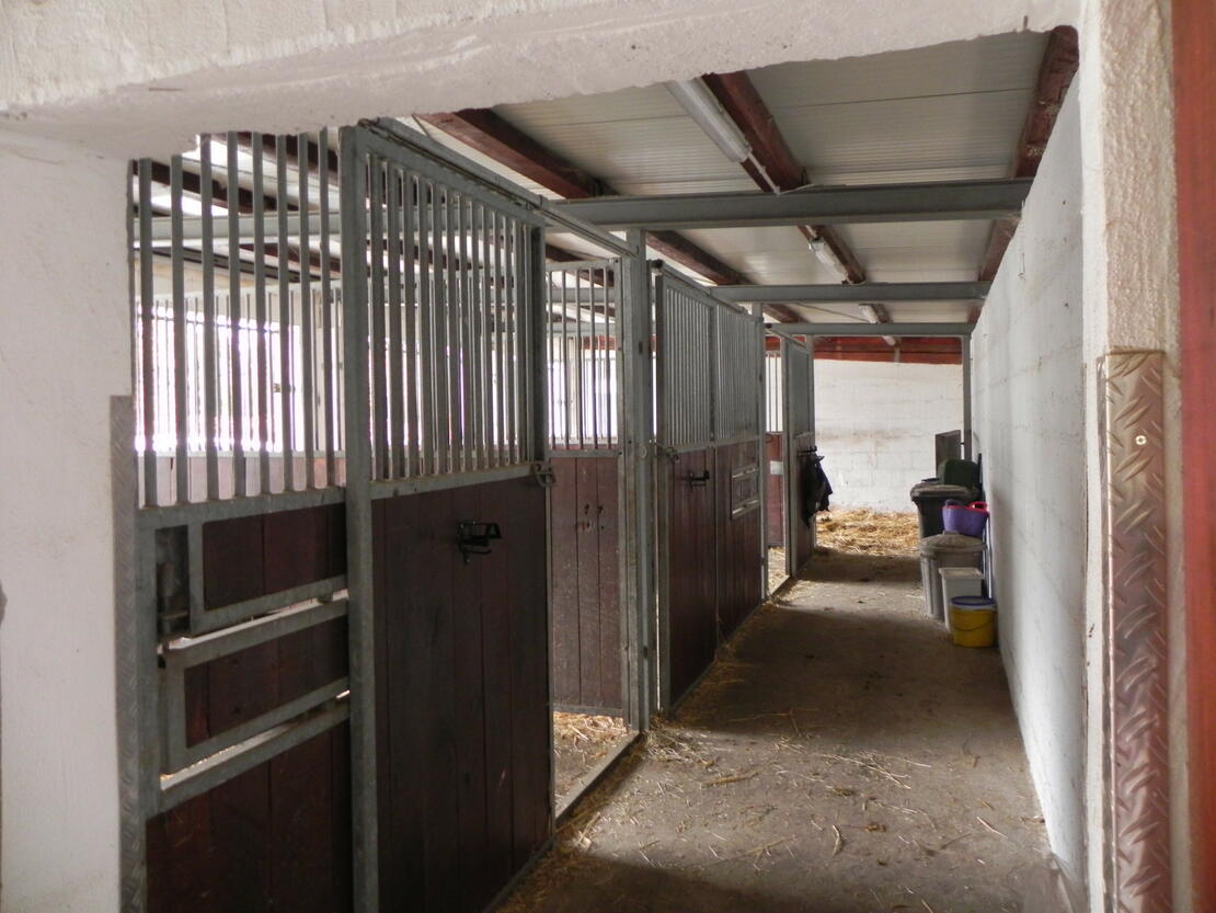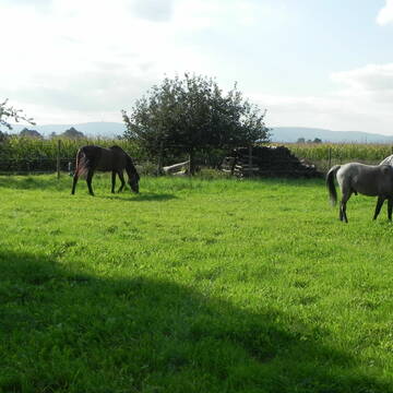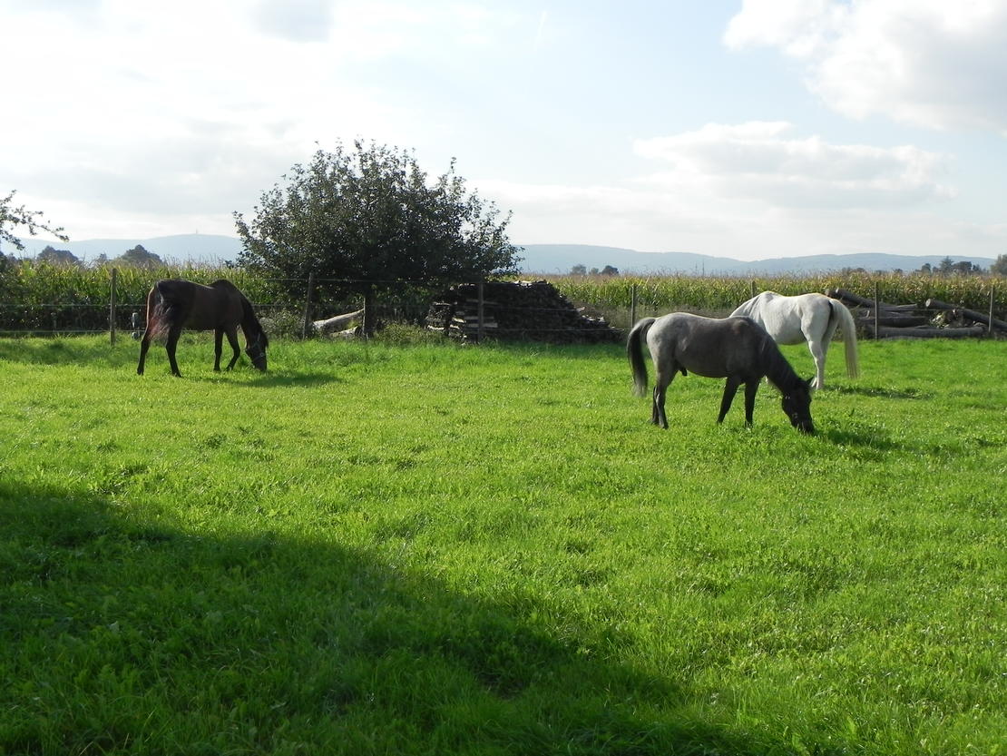 kl. Freizeitreiterstall im Familienbetrieb mit Pensions- und eigenen Pferden . Tagsüber stehen die Pferde in einer Gruppenherde - im Sommer auf der Weide, im Winter auf dem Paddock . Wir bieten Vollpension, d.h. Heu und Stroh aus eigenem Anbau, Füttern, Misten und Bring- und Holservice an den entsprechenden Standort sind im Preis inbegriffen. ( Preisauskunft auf Anfrage.) Es steht eine Bewegungshalle zur Verfügung (ca 20 m x 20 m), sowie ein Reitplatz ( ca 20 m x 40 m). Schönes Ausreitgelände schließt sich dem Hof an. Gerne nehmen wir auch Rentnerpferde. Es stehen Einzelboxen, als auch 1 Doppelbox (ggf. auch trennbar , ideal für zwei Pferde die sich kennen) , zur Anfrage zur Verfügung.