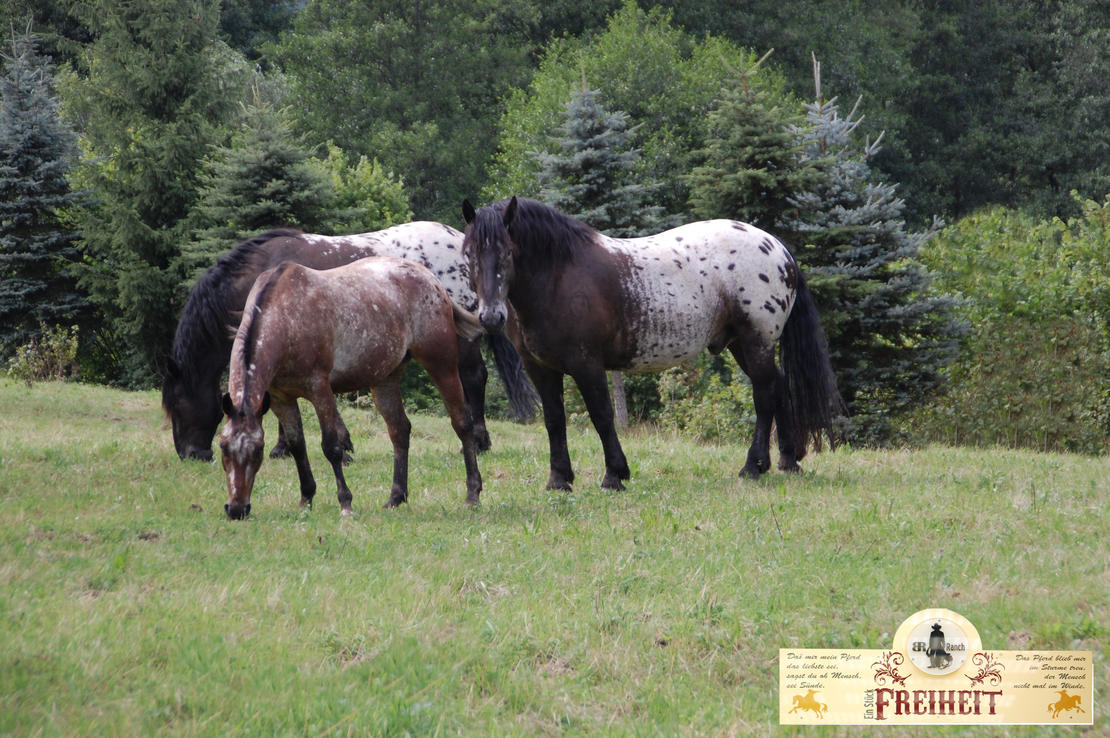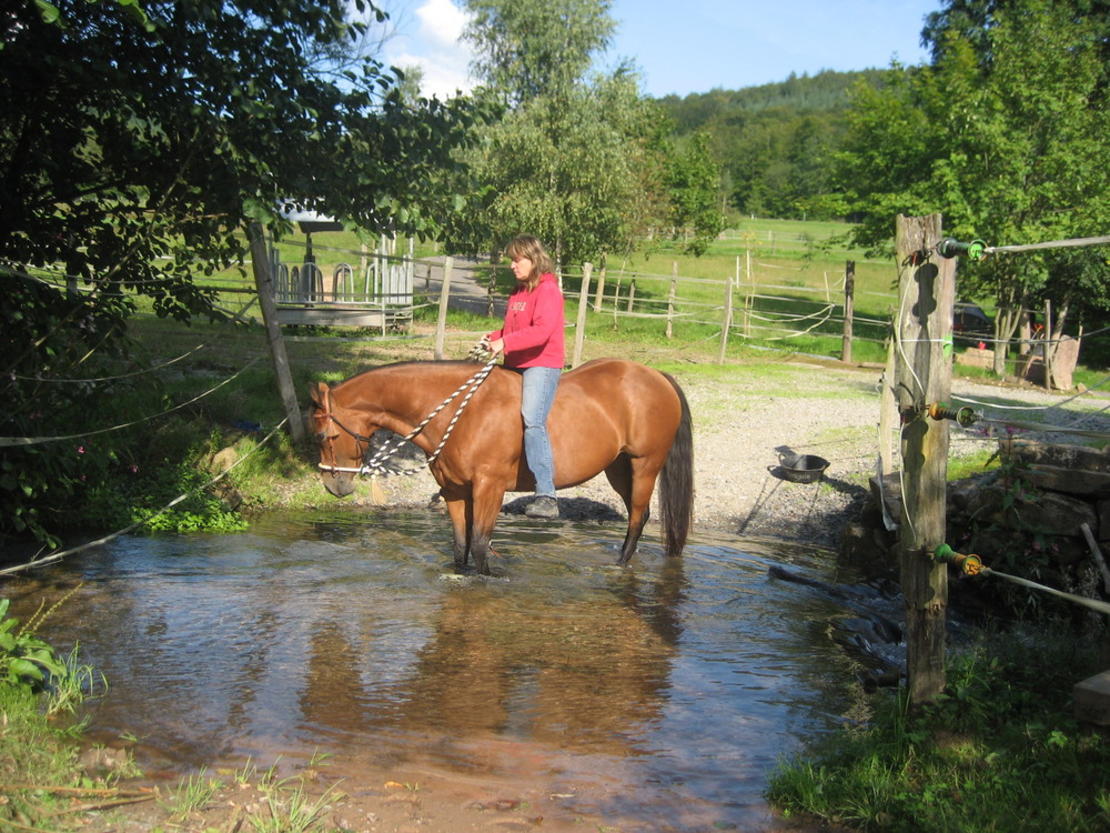 Wir sind eine nette Stallgemeinschaft in einem kleinen, gepflegten Freizeit- u. Westernstall mit Wohlfühlcharakter, in mitten des schönen Spessart's. Das traumhafte, weitläufige und waldreiche Ausreitgelände, direkt ab Stall, lädt zu unendlichen Ausritten ein. Aber auch unsere Reithalle, mit Reiningboden (Gude-Boden) und der große Reitplatz oder das Round Pen laden zu ausgedehnten Trainingsstunden ein. Unsere Pferde leben im Herdenverband, in Gruppen unterteilt, auf großen Weiden, teils mit Bachlauf, Baumbestand oder Unterstand. Im Sommer geniessen die Pferde ihre Freiheit rund um die Uhr auf ca 20 ha Weidefläche. Für die Rehepferde steht unser neuer Bewegungsstall mit geräumigem Auslauf (ohne Gras), Heuraufe, Liegefläche im Freien, großem Innen-Schlafbereich, Wassertränke etc. zur Verfügung. Im Winter, je nach Wetterlage, kommen die Pferde von morgens bis abends auf extra Winterkoppeln (je Gruppe 1 ha) mit befestigten Paddock's und je einer Heuraufe pro Gruppe, die stets gefüllt ist. Die Tränkebecken sind natürlich beheizt! Wir legen sehr viel Wert auf artgerechte Haltung und Sauberkeit, daher geniessen unsere Pferde soviel Weidegang und freie Rauhfutteraufnahme, wie das Pferdeherz begeehrt (keine Heurationierung) und werden zweimal täglich gemistet und mit Kraftfutter zugefüttert. Das Heu/Heulage beziehen wir aus eigener Ernte und ist daher nahezu staubfrei. Aufgrund des guten Stallklimas, bester Futterqualität, individueller Betreuung, Bachlauf direkt am Hof und eines orthopädischen Hufschmiedes direkt vor Ort auch bestens geeignet für Allergiker, Rehepferde, Gnadenbrotpferde und Rentner. Für die Fußkranken und Erholungsbedürftigen steht ein angestauter Bachlauf für ausgiebige Fußbäder zur Verfügung. Wellness für Ihr Pferd! Und sollten Sie mal keine Zeit haben, so kümmern wir uns gern liebevoll um Ihren Liebling. Für Natur-Pferdenarren die erholsame Tage suchen, steht eine kleine Ferienwohnung (1Pers) zur Verfügung! Unser Preis beträgt bei VP 350,00 € inkl. Kraftfutter! Wir sind da wo Ihr Pferd noch Pferd sein darf!