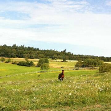Der Auslauf steht deinem Pferd jeden Tag zur Verfügung, ausgestattet mit einer jederzeit zugänglichen Heuraufe und Selbsttränke. Die grünen Wiesen rund um den Hof und in näherer Umgebung bieten viel Platz und frische Luft. Unser Paddocktrail wird im Juli fertiggestellt, so dass ab August eingezogen werden kann. Mehrere Fressplätze und ein ca. 400 m langer Trail stehen dann neben einer besandeten Liegefläche mit Unterstellmöglichkeit zur Verfügung.