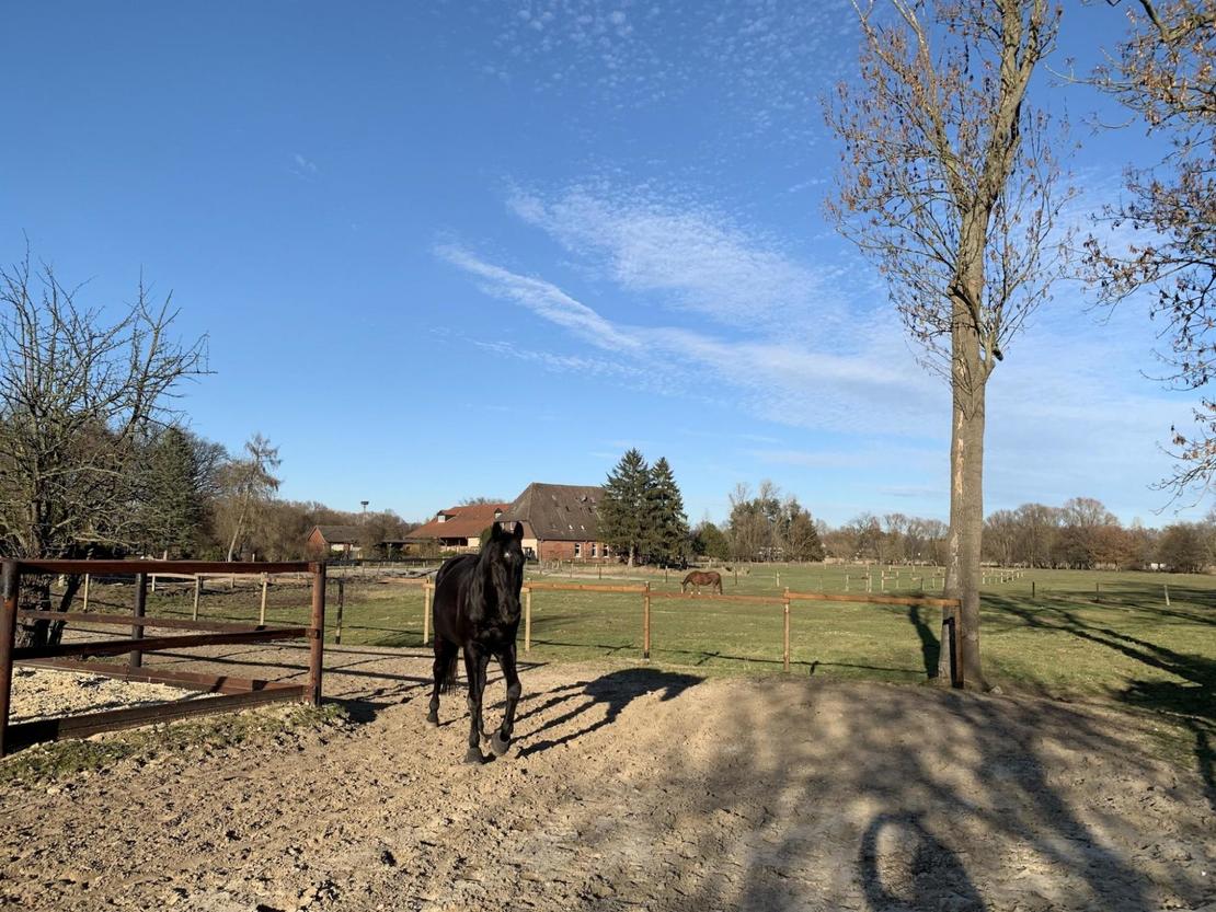 Wir bieten Freizeit-, Turnier- und auch Rentnerpferden eine artgerechte Haltung auf ca. 9000 m² : Das Pferd als ein Herden- und Fluchttier ist von Natur aus darauf angelegt, sich mindestens 19 Stunden am Tag gemeinsam mit Artgenossen zu bewegen und dabei Futter in kleinen Portionen aufzunehmen.