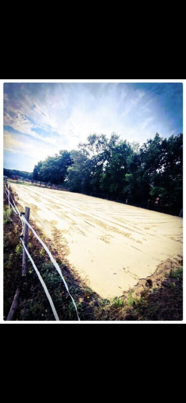Wir haben eine kleine Halle ( ca 40*13 ) mit neuem Boden , einen großen Reitplatz mit neuem Sandboden und Flutlicht ( der zum nächsten Winter eine Überdachung erhält) , einen Roundpen , einen Working Equitation Trail mit Brücke/ Wippe, Slalom, Tonnen , Garrocha, Glockengasse und gute Ausreitmöglichkeiten direkt ab Hof.