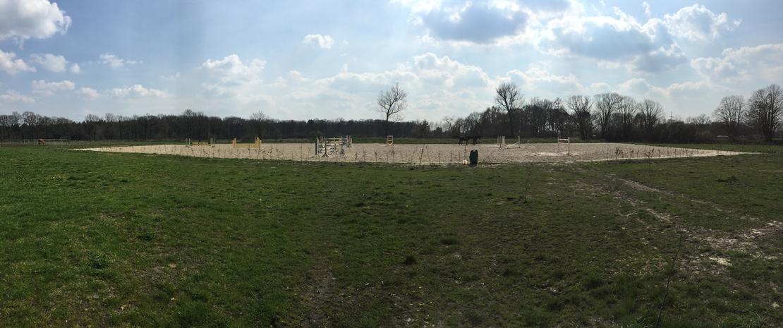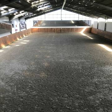 Halle mit Fairgroundboden (Dressur) 20x40, Springplatz mit Fairgroundboden 40x80, Longierzirkel nicht überdacht 16 m, Sandviereck 20x60m.