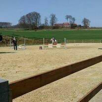 Zu der Reitanlage gehören: 1 Reithallen, 16m x 32m 1 Longierhalle 1 Roundpen 1 großer Außenplatz 25 x 45 m groß mit Reitsand von Stremmer und mit Flutlicht (der Platz ist das ganze Jahr über bereitbar und springtauglich), beleuchtet