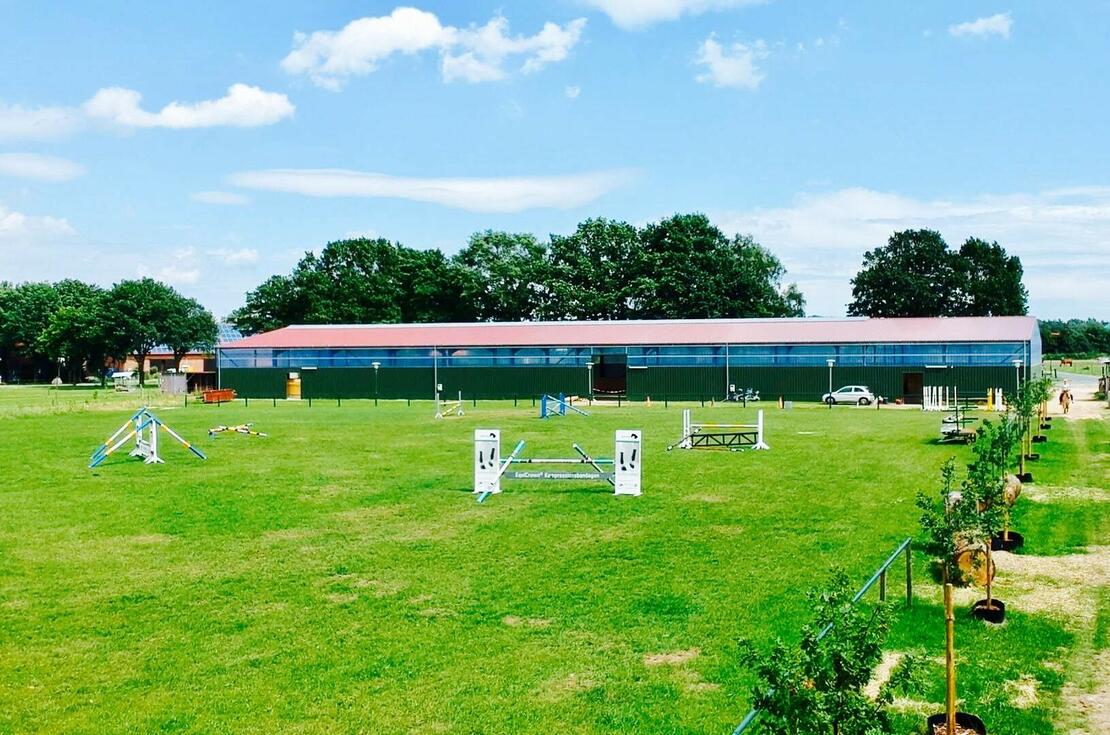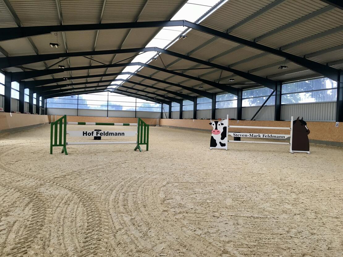 Reithallen Zu unserem Hof gehören zwei Reithallen. Eine 20x60 Reithalle mit fair ground Boden und eine 15x30 Reithalle mit "grünem Sand" direkt am Hof.