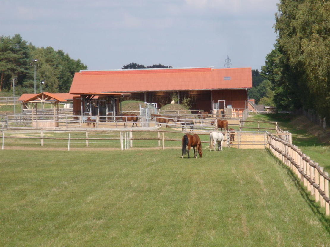 Die Reitanlage bietet eine Reithalle (20 x 60 m), einen Reitplatz (20x60m) und einen Longierplatz (20x30m); die Außenplätze sind beleuchtet. Auf einem Grasplatz mit Hindernissen und einer hofeigenen Geländestrecke sind optimale Bedingungen für Training und entspanntes Reiten gegeben. Der Waschplatz verfügt über kaltes und warmes Wasser; unter dem Solarium können die Pferde nach dem Waschen u./o. schweißtreibender Arbeit getrocknet werden. Der Kraftfutterautomat stellt individuelle Rationen aus Hafer oder haferfreiem Müsli zusammen. Ihre Rationen können die Pferde über den Tag verteilt in kleinen Portionen abrufen. Das Raufutter ist für die Pferde jederzeit zugänglich, kann aber je nach Bedarf angepasst werden (z.B. zusätzlich zur Weide energieärmeres, im Winter gehaltvolleres Raufutter). Von Mai bis Ende Oktober gehen die Pferde zusätzlich tagsüber auf die Weide. Insgesamt stehen den Pferden ca. 10 ha Weiden zur Verfügung.