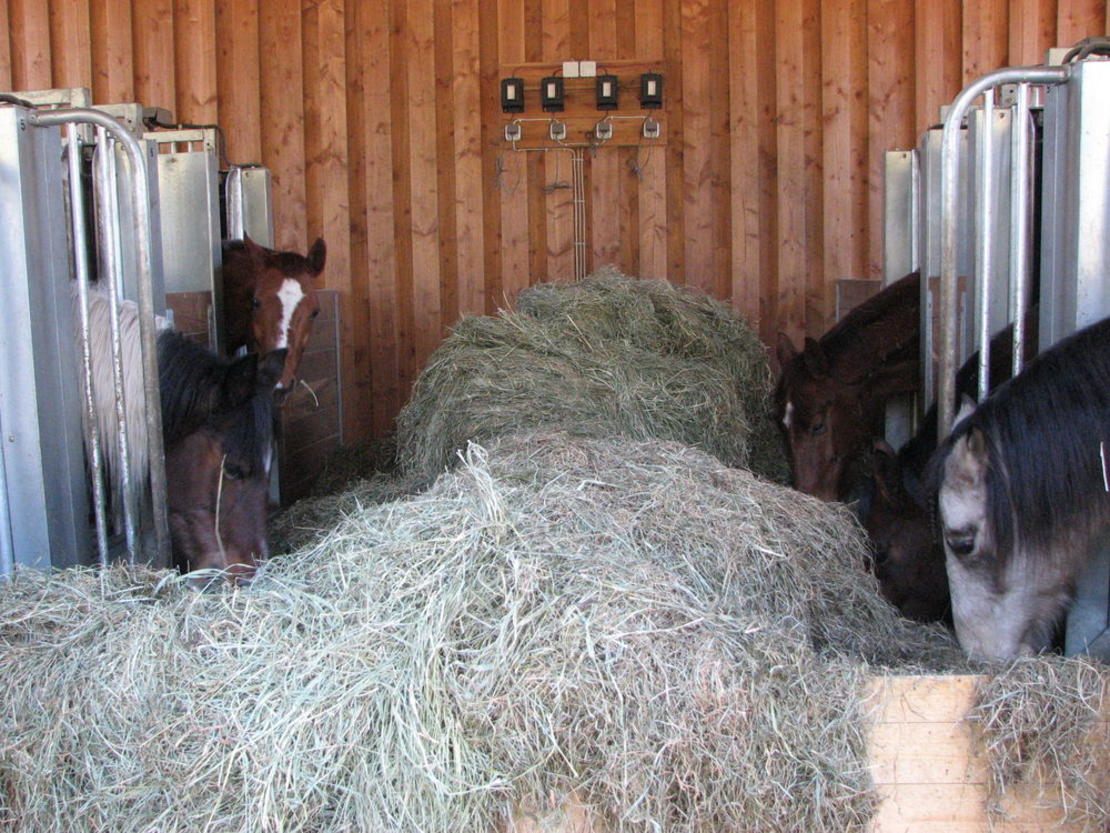 Die moderne Fütterungstechnik erlaubt eine individuelle Aufnahme von Kraft- und Raufutter. Abweichungen vom normalen Fressverhalten werden über die tägliche Auswertung sofort erkannt. An der Reithalle stehen Paddockplätze mit Heuraufen zur Verfügung. Die Pferde kommen sowohl im Winter als auch im Sommer auf entsprechend eingerichtete Weiden.