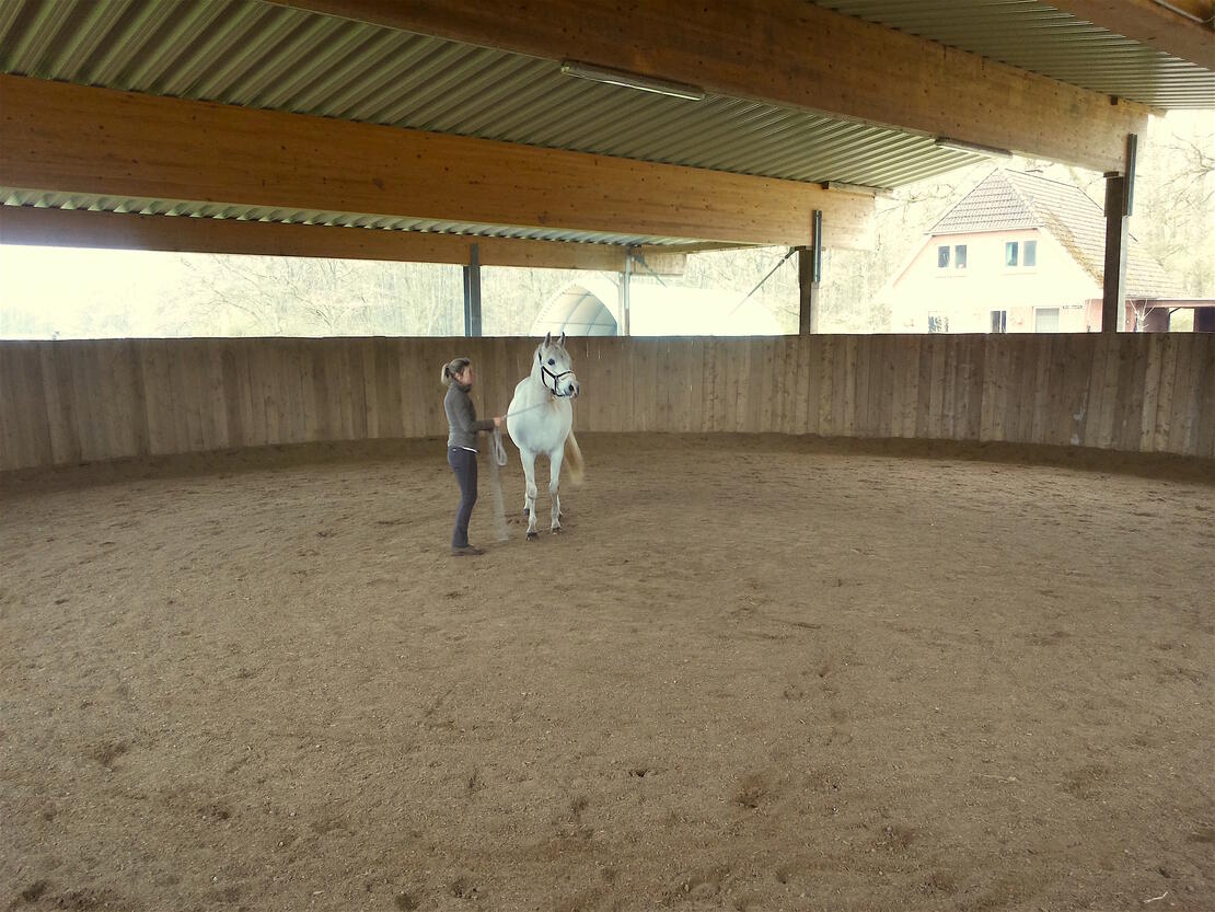 Außerdem sind eine Reithalle, eine Longierhalle (Durchmesser: 18 m) sowie ein großer, beleuchteter Außenreitplatz vorhanden und der Hof grenzt direkt an ein üppiges, wunderschönes Ausreitgelände.