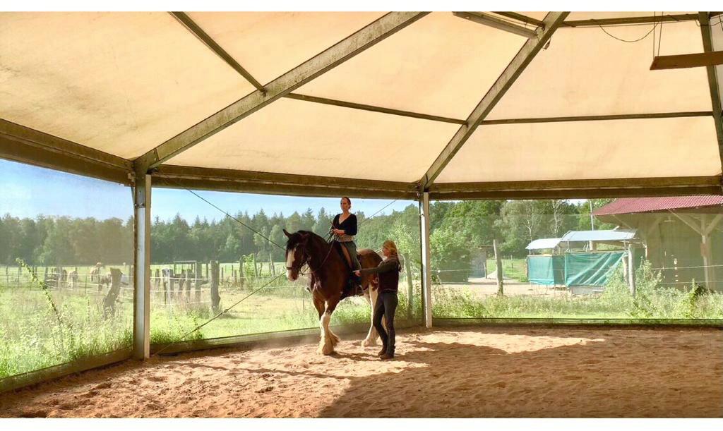 • Ein windgeschütztes, überdachtes, beleuchtetes Reitzelt, in dem man konzentrierte Reiteinheiten mit seinem Pferd erleben kann (siehe Foto)