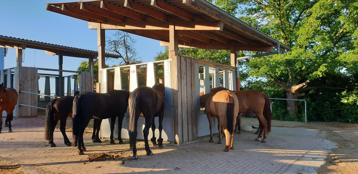 - große Boxen mit eigener Raufe (hell, luftig, halb hohe Wände nach vorne)