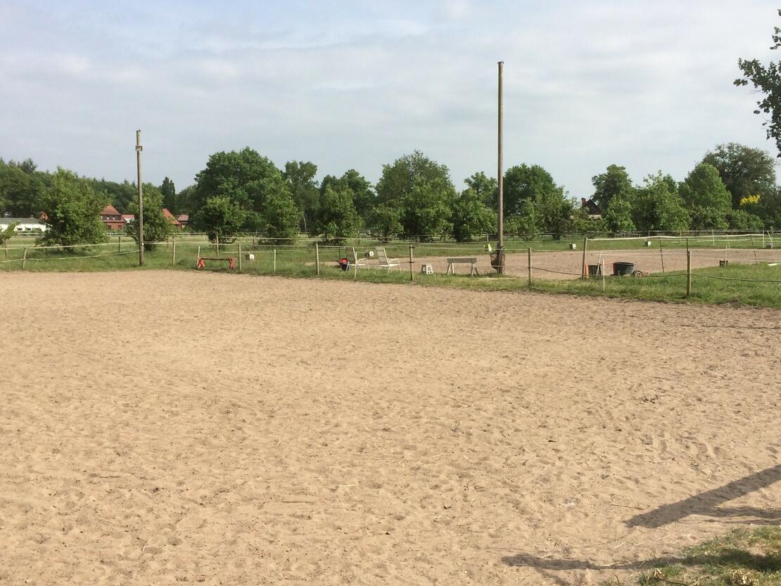 Hallo! Mein Mann, gelernter Landwirt, und ich, Reitpädagogin, bewirtschaften einen landwirtschaftlichen Pferdebetrieb mit netter Stallgemeinschaft mitten in Donnerstedt/Thedinghausen. Alle nötigen Ämter haben sich von unserem Raufutter, der Haltungsform und dem Zustand unserer Anlage überzeugt und offiziell für sehr gut befunden. Es sind z. Z. reine Freizeitreiter bei uns, die die ruhige Atmosphäre genießen und da legen wir besonderen Wert drauf, dass das auch so bleibt. Jeder ist hier herzlich willkommen. Auch die, die nicht mehr reiten können oder möchten. Nur bitte ohne gezicke untereinander und Offenheit bzw. Ehrlichkeit uns gegenüber ! ;) Wir haben viele Grünflächen, die in unterschiedliche Sommerweiden eingeteilt werden können. Allerdings nicht diese typisch satten und überdüngten Weiden. Gleich gegenüber von uns ist unser eigener Wald, das Adelige Holz und es gibt noch viele andere abwechslungsreiche Ausreitmöglichkeiten. Die Reithalle ist mit Pferd 10 Min. entfernt und kann gegen Gebühr beim Besitzer gemietet werden. Es stehen zwei Naturreitplätze, (einer mit Beleuchtung), ein Spielplatz und ein Roundpen zur Verfügung. Verschiedene Elemente wie Dualgassen, ein Sandhügel, Podest mit Stufen, Cavalettis, zwei Wippen usw dürfen natürlich auch von jedem genutzt werden. Die Pferde haben einen gut 700m Paddocktrail. Es wurden an den Seiten kleine Gräben gezogen, in denen zur Regenzeit das Wasser absickern kann. Viele Büsche und Bäume bieten Wind- sowie Sonnenschutz und Möglichkeiten zum Schubbern. Die Herden sind vom Alter, Geschlecht und Rassen bunt gemischt. Für jede Herde stehen natürlich Zelte, 24Std/täglich Heu und Lecksteine zur Verfügung. Ebenso gibt es das ganze Jahr Weiden zum Austoben und liegen. Die Pferde sind im unterschiedlichsten Alter. Auf Grund unserer großen Fläche und des ständigen Heu- und Weideangebotes, ist es sehr harmonisch untereinander. Es gibt keinerlei Fressneid o. Ä. Im Notfall besteht die Möglichkeit, vereinzelt ein Tier (ansteckende Krankheit) abzutrennen. Ein großzügiges Sandpaddock mit Heu gibt es für Stoffwechselkranke, wie z. B. EMS, Cushing und/oder Rehe-Patienten. Dort stehen vom Friesen-Mix bis zum Shetty. Auch dort ist alles so angelegt, dass die Pferde einige Meter von den Raufen, zum Wasser und/oder Unterstand laufen müssen. In welche Herde, die Besitzer ihre Pferde/Ponys letztendlich stellen, darf natürlich jeder selber entscheiden. Es kann selbstverständlich auch notfalls umgestellt und „ausprobiert“ werden. Wir sind offen für Vorschläge und versuchen alle Wünsche, wenn möglich, umzusetzen. Zusammengefasst bieten wir: Roundpen, TÜV zugelassenen Anhänger (geg. Gebühr) als Solekammer und/oder ausleihen zum Transport, Unterstände, 24 Std. Heu, 1-2 Raufen/Herde, Wasser, zwei Reitplätze, Wippen, Podest, gepflasterten Waschplatz, abschließbare und beheizte Sattelkammer, eine Waschmaschine und den ganzen Tag Auslauf auf dem Paddock-Trail bzw. den Weiden. Ein normaler Ultraschallinhalator steht gegen Gebühr auch jederzeit zur Verfügung. Wir haben KEINEN typischen Arbeitsdienst für unsere Einsteller. Ihr sollt hier ja in erster Linie eurem Hobby nachgehen. Für die Zweibeiner gibt es eine öffentliche Toilette. In der Sattelkammer steht ein Wasserkocher und es kann sich dort bei Tee, Kaffee oder einer Limo gerne jederzeit zusammengesetzt werden. Es gibt Sitzgelegenheiten, wo sich unsere Einsteller treffen und manchmal einige Stunden verweilen um sich austauschen/abzuschalten. Es wurden/werden bei uns auch verschiedene Kurse, wie z.B. Massage- und erste Hilfe am Pferd, Clickerkurs und Gebisskunde angeboten. Natürlich darf jeder seine Vertrauten Tierärzte, Trainer, Schmiede usw hier weiter behalten. Für Camper haben wir Stellplätze und sind vom VfD zertifizierte für Wanderreitstation. Stallbesichtigungen nur nach Terminvereinbarung.