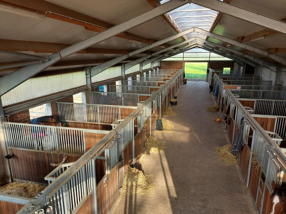 Der familiengeführte, bäuerliche Betrieb der Familie Radmacher betreibt hier eine Pferdepension mit 40 Pferden. Neben einer großen Reithalle (20x40m), einem Außenplatz (30x40m) mit Flutlich, einem überdachten Longierzirkel (18m Durchmesser) und Führmaschine bieten wir großzügige Sommerweiden und befestigte Winterpaddocks mit Futterraufen. Die Stallungen bieten Licht- und Luftdurchflutete Innenboxen sowie Paddockboxen mit Wohlfühlatmosphäre für Pferd und Reiter. Die Stallungen sind insbesondere auch für Allergiker sehr gut geeignet, da eine ständige Frischluftzufuhr gewährleistet ist und auch kaum Staubentwicklung aufkommt. Das Einstreu sowie Futter wird zum großen Teil in Eigenleistung von den eigenen Flächen produziert und somit können wir eine kontinuierliche gute Futterqualität bieten!
